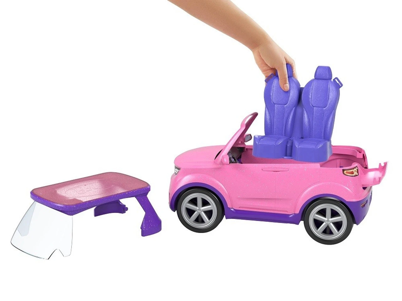 - Take the show on the road in a glittery pink and purple SUV with rolling wheels, realistic details and room for 2 Barbie® dolls (sold separately).