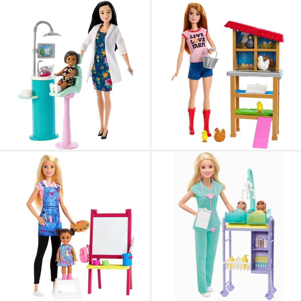 Explore new careers in depth with the Barbie careers complete play sets. From medicine to teaching, these focused females nurture and care for all sorts of little charges, opening up a world of possibilities. Wearing iconic outfits with the perfect pieces needed to perform their work, these dolls are not only dressed to impress but ready to get the job done. Choose from a toddler Doctor or grade school teacher. Each set comes with one Barbie doll, a large accessory (like an examination table or blackboard), a themed piece-count (including items like a stethoscope or globe) and a little charge (like a patient or a student). each sold separately, explore all of your favourite careers with Barbie.