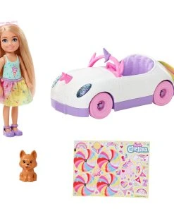 Imaginations can hit the road to anywhere with Chelsea™ doll, her puppy and an adorable, unicorn-inspired vehicle! The convertible features a glittery body, rainbow bumpers, a unicorn hood ornament and rainbow-bright streamer tail, plus a sticker sheet that lets kids customize the ride. Chelsea™ doll wears a rainbow tie-dye skirt, molded unicorn top and purple shoes. Complete the look with an adorable pair of heart-shaped sunglasses.