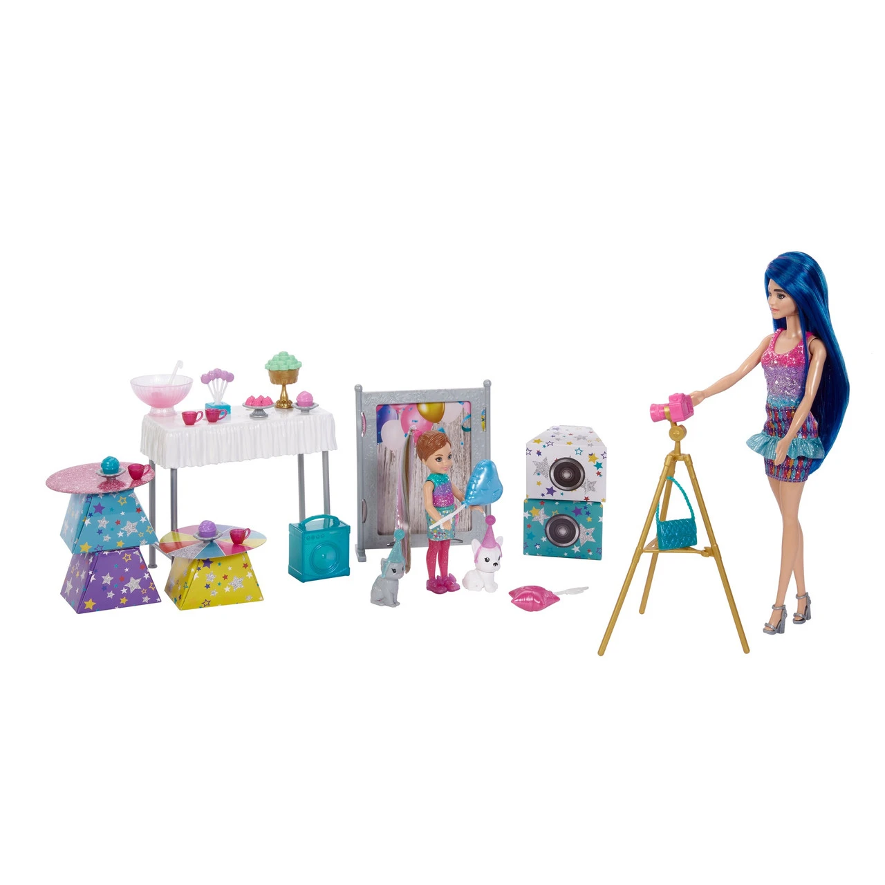 - Open the set and play the unboxing game to find 21 mystery boxes hiding Barbie and Chelsea dolls covered in metallic confetti star print, a pink metallic kitten, a purple metallic puppy, hair pieces, fashion accessories and party props like a Barbie-branded disco ball!