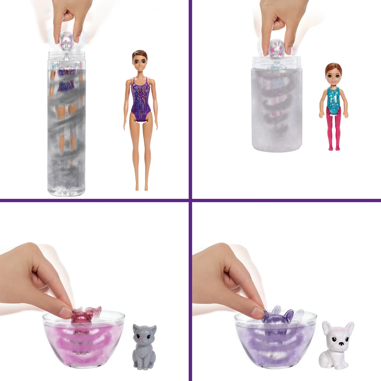 This Barbie® Colour Reveal™ set delivers the ultimate in unboxing experiences with more than 50 surprises, including a Barbie® Colour Reveal™ doll and Colour Reveal™ Chelsea™ doll in a silvery metallic coating with colourful confetti stars, plus two Colour Reveal™ pets in metallic pink and purple!