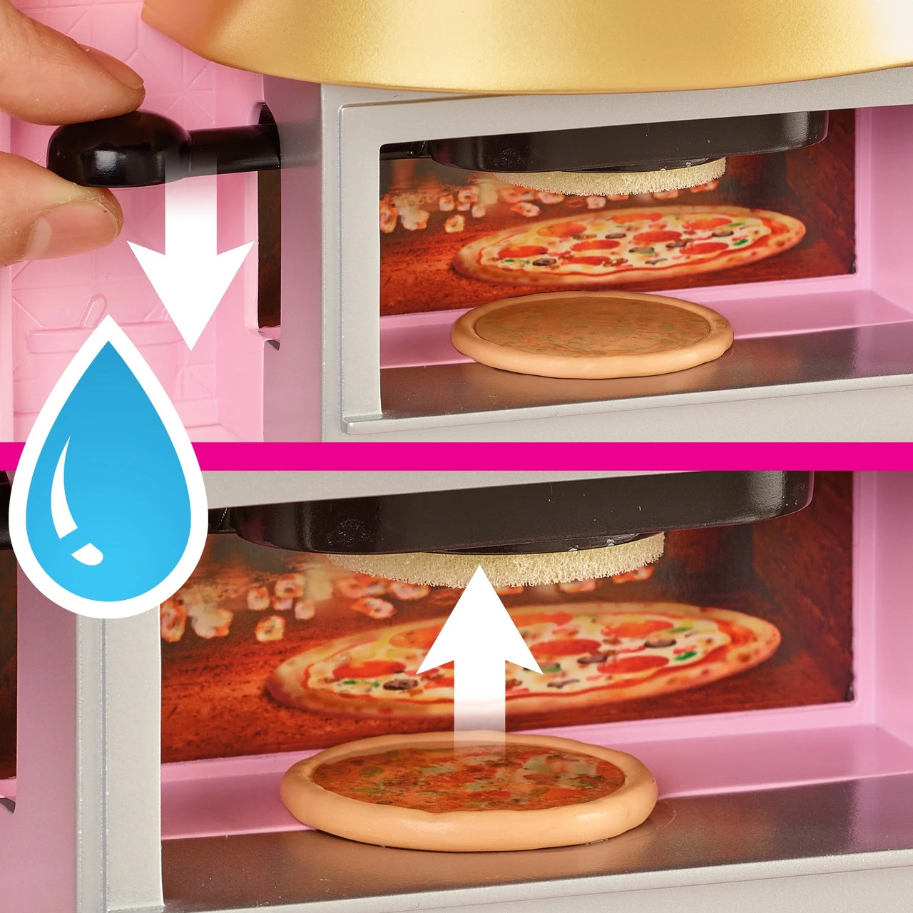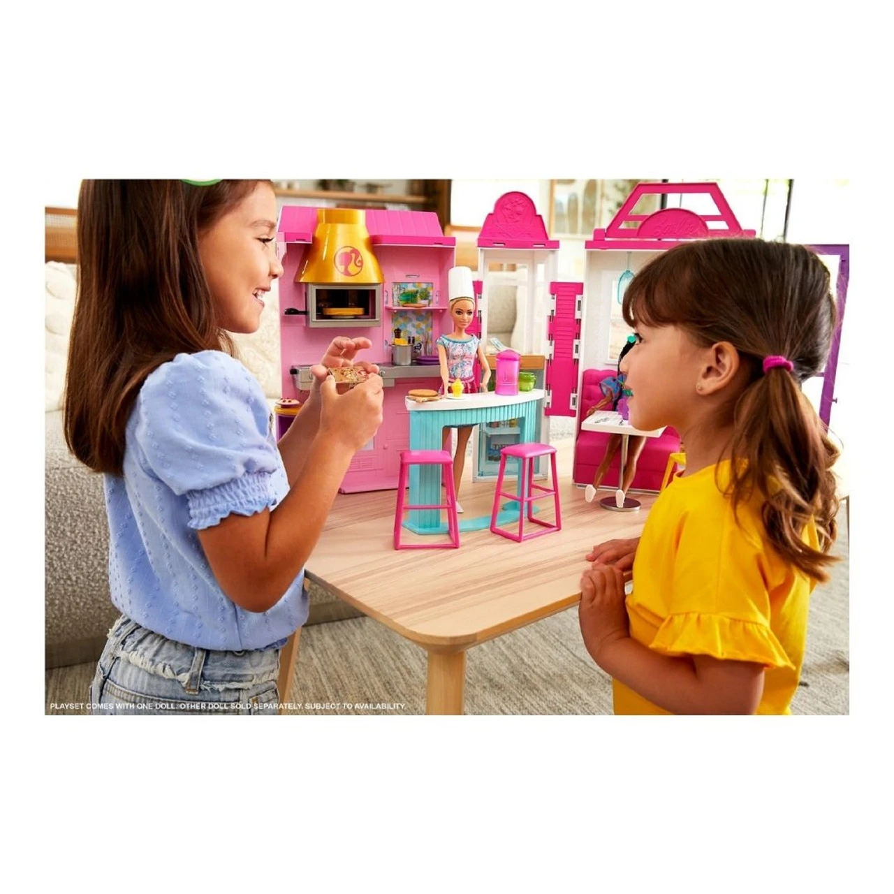 Young foodies can serve up all kinds of storytelling fun with the Barbie Cook ‘n Grill Restaurant doll and playset! Featuring a colourful and modern design, six play areas and 30+ total pieces, this café-inspired set sparks endless imagination. Barbie doll is ready for a day of work and play in a dress, adorable pink apron and chef’s hat. Kids can help her take orders at the to-go window or seat up to four guests at the dine-in counter and patio booth seating. Then, head into the kitchen to flip burgers on the rotating grill, arrange sweet treats on the rotating dessert display, pop a pizza in the oven and watch it change colours when it’s ‘cooked!’ With 30+ total pieces and so many storytelling opportunities, kids ages 3 years old and up can play out their Barbie stories as a chef, server, customer or all three! Doll cannot stand alone. Colours and decorations may vary. Serve up storytelling fun with the Barbie Cook ‘n Grill Restaurant doll and playset featuring a modern design, 6 play areas and 30+ total pieces! Help Barbie doll take to-go orders at the service window or seat up to 4 guests at the dine-in counter and patio booth. Head to the kitchen to flip burgers on the rotating grill and display treats on the rotating dessert display. Pop a pizza in the oven and press the lever to see it change colour when it’s ‘cooked! ‘Kids can play out endless scenes with over 30 pieces, like a cash register, menus, drink dispenser, food plates, utensils, beverage accessories and more. – Product Dimensions: Height: 43.1cm x Depth: 19.0cm x Width: 81.5cm – WARNING: CHOKING HAZARD. Small parts. Not suitable for children under 3 years.