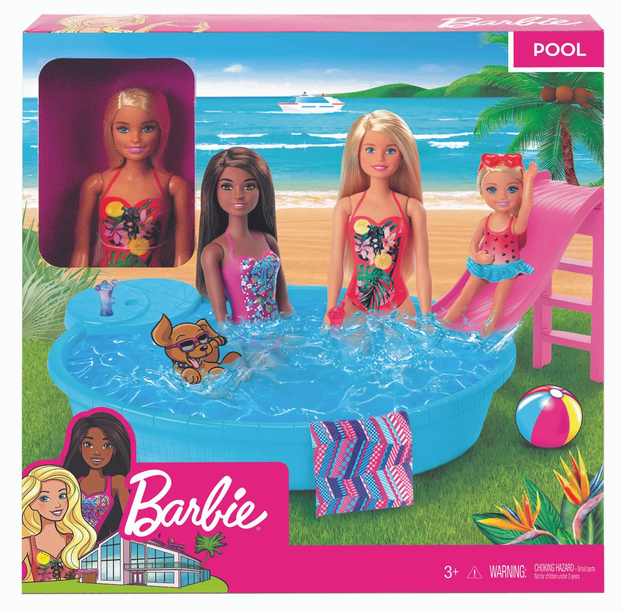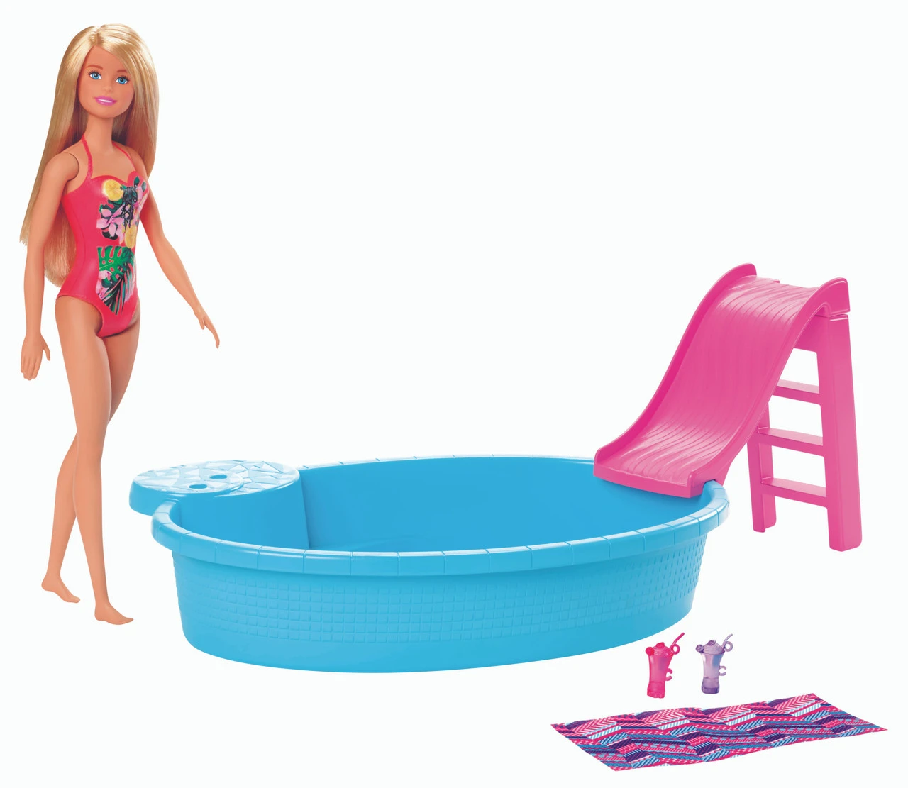 - Imaginations 3 to 7 years old can play out so many summertime stories with Barbie® doll and her pool! Collect other Barbie® dolls and accessories to expand the playtime possibilities (each sold separately, subject to availability). Barbie® Doll, 11.5-inch Blonde, and Pool Playset with Slide and Accessories