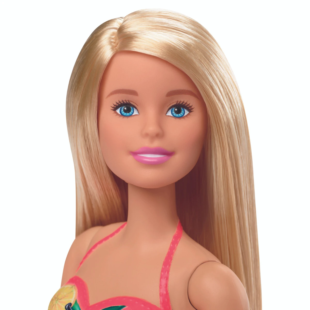 - In bright swimwear with a flowery graphic, Barbie® doll is ready for fun in the sun.
