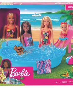 - Young imaginations can make a splash with Barbie® doll and her fun pool! ?Help Barbie® doll climb the ladder and slide right in or lounge around in the built-in seating area.