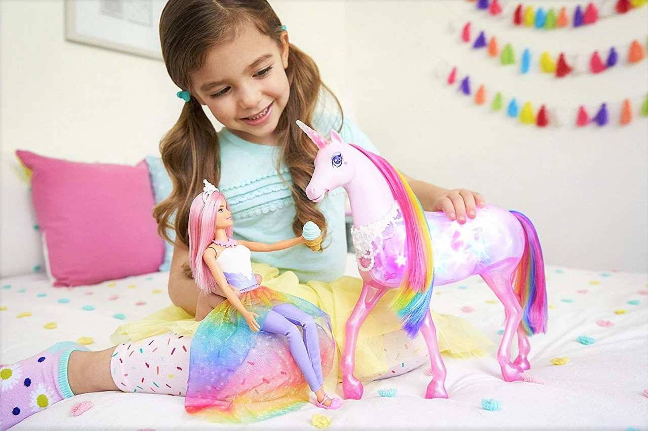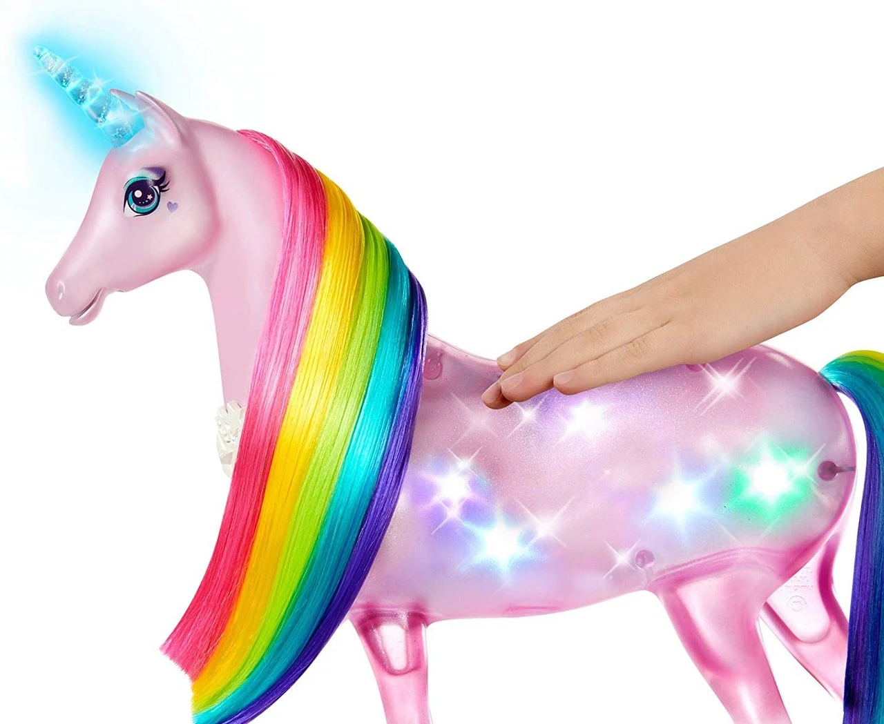Spark imagination with Barbie Dreamtopia magical lights unicorn and Barbie princess doll, fairytale lovers can play out so many storylines with whimsical light shows and sound effects, both activated by touch. There are multiple ways to play: touch or pet the unicorn’s body, tap its horn or feed it a snack to see colourful, starry lights and hear music or sweet sounds. Help Barbie doll feed the unicorn with the included ice cream cone accessory to hear it “munch” on its snack and watch it light up or hold the unicorn’s body to hear galloping sounds. Barbie doll bends at the knees and wears pants under her sheer, rainbow skirt so she can easily sit on unicorn’s back and ride along. When it’s bedtime, tap and hold the unicorn’s horn to watch it fall asleep with a special light pattern, snoozing sound effects and a sweet lullaby. Fairytale lovers can tell all kinds of fantastical stories because when you enter Dreamtopia, you wake up to a world where dreams become reality, collect all the Barbie Dreamtopia dolls and toys and let your dreams set sail. Barbie Dreamtopia magical lights unicorn makes the perfect gift for 3 to 7 year olds. Includes Barbie Dreamtopia magical lights unicorn, ice cream cone accessory for nurturing play and Barbie princess doll wearing fashion and accessories. colours and decorations may vary.