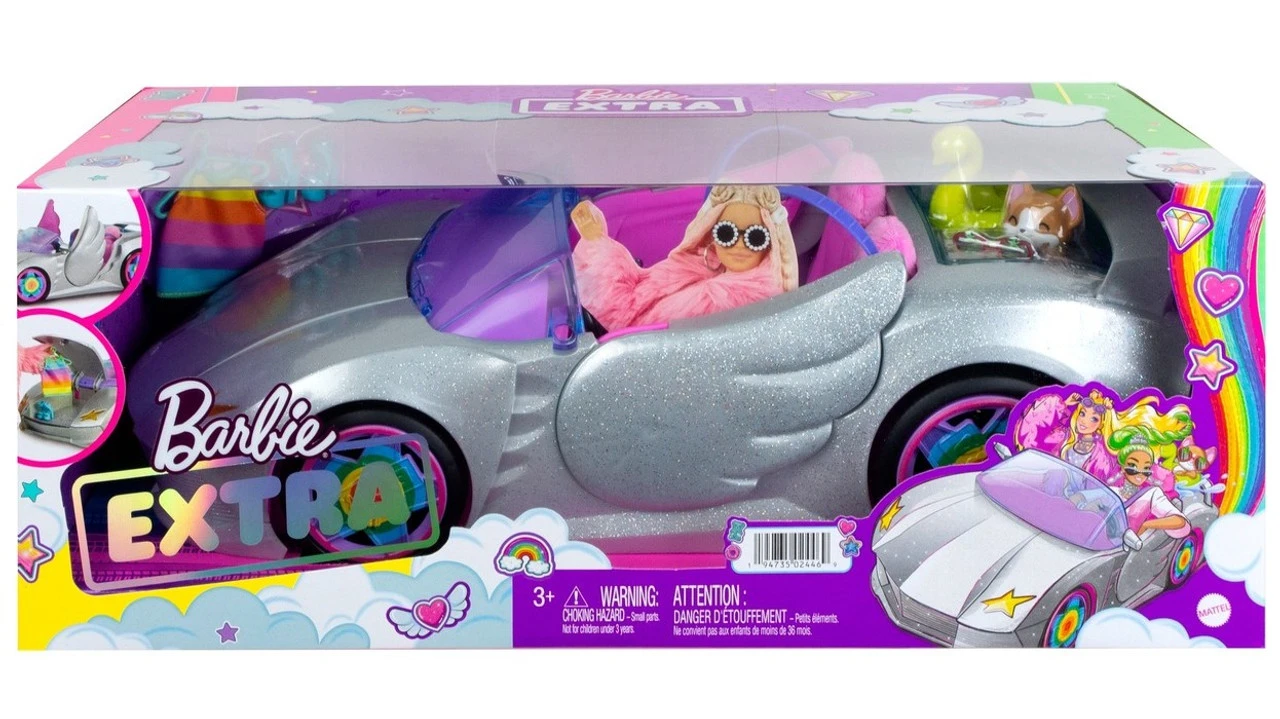 When it comes to style, Barbie Extra dolls have a ‘more is more’ attitude — and this Barbie Extra Vehicle is no exception! Kids can hit the road in style with this sporty, two-seater convertible car featuring a sparkly silver exterior, signature pink interior and over-the-top details including rainbow rims, wing-inspired doors and furry headrests. When it’s time for an outfit change, pop the trunk — it features space to store a pair of shoes and a trendy top, both included! Place the pet puppy and its adorable swan floatie in the pet pool at the rear of the car, then push to get the story started. With so many bold accents and fun accessories, this Barbie Extra car lets kids bring EXTRA vibes wherever they go! Dolls sold separately. Colours and decorations may vary. The Barbie Extra Car is equipped with everything the Extra dolls need to ride around in style! The 2-seater sports car features an all-pink interior and sparkly silver exterior with wing-inspired scissor doors, star-shaped headlights and rainbow rims stamped with the Barbie Extra logo. When it’s time for an outfit change, open the hood and discover a pop-up clothing rack with space to store included fashion pieces, like the rainbow top and a pair of shoes! The rear of the car features a pet pool area for the included corgi puppy, equipped with a floatie and stylish shades! Additional over-the-top details include furry headrests, ‘leather’ sculpted seats, textured flooring and a Barbie Extra license plate. – Product Dimensions: Height: 12.08cm x Depth: 21.06cm x Width: 40.5cm – WARNING: CHOKING HAZARD. Small parts. Not suitable for children under 3 years.