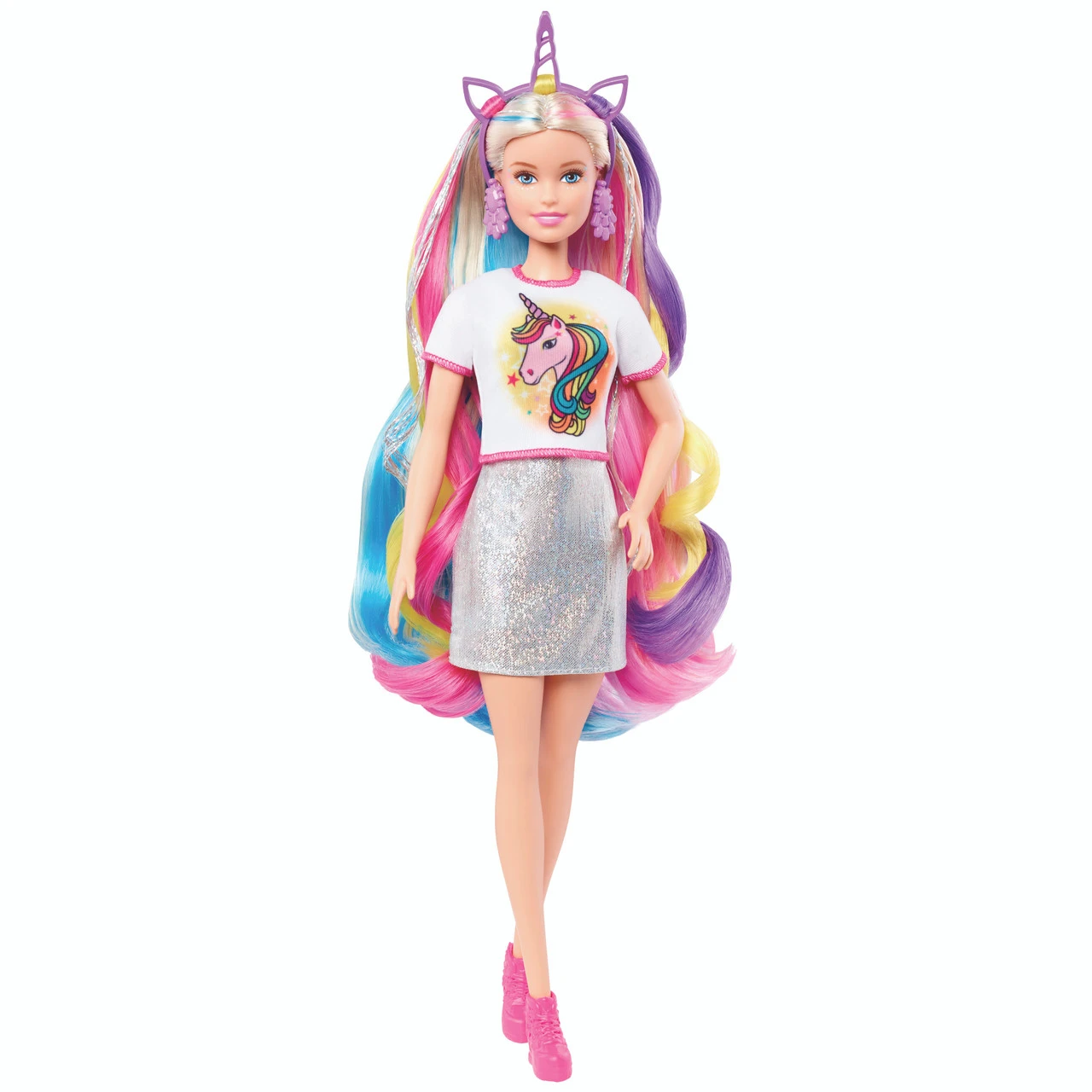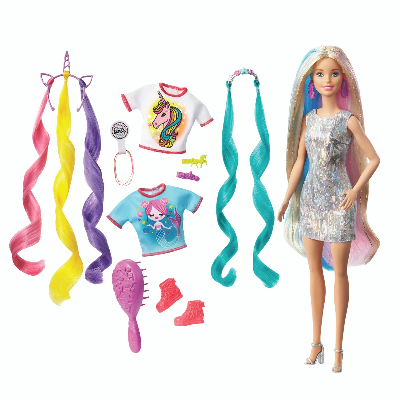 Unicorn or mermaid? Barbie® Fantasy Hair™ doll doesn’t need to choose — she comes with two fantasy looks that each include a colorful crown with hair extensions, themed top and accessories. The transformation to a mermaid or unicorn is easy!