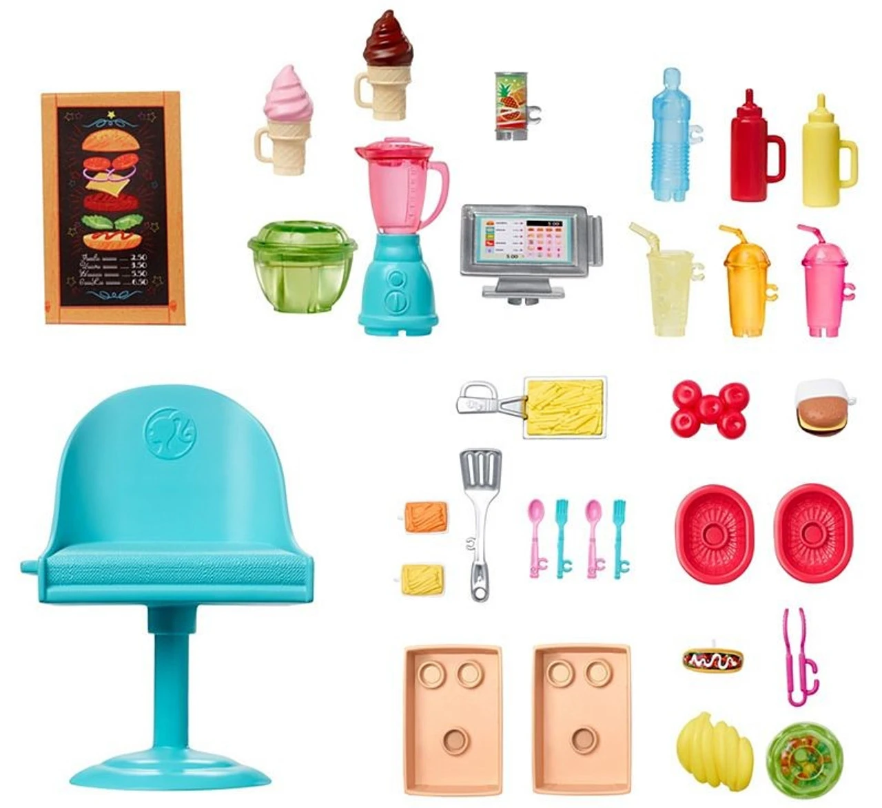 - Barbie® doll (sold separately) can make all kinds of yummy food for her customers including salads, burgers, tacos, fries and more! When a customer’s order is ready, Barbie® doll can ring it up at the register!