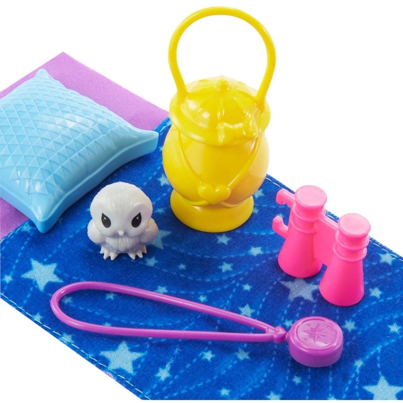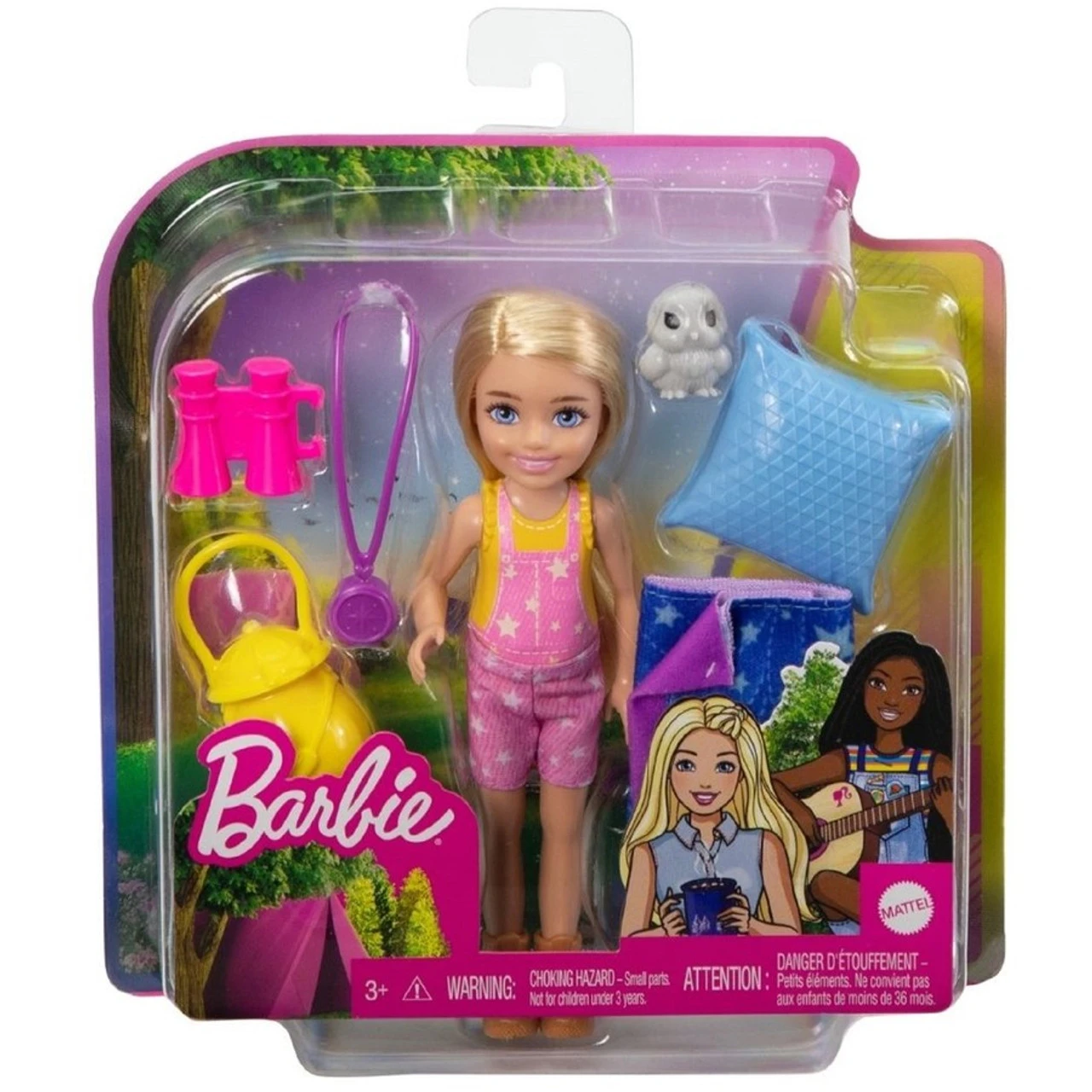 Head to the great outdoors and play out camping fun with Chelsea doll inspired by onscreen adventures from the hit Barbie series, It Takes Two! This playset features everything kids need to play out day-to-night camping fun with Chelsea doll and her adorable baby owl pal. Play out a day of exploration with Chelsea doll and her pet, a pair of binoculars and a compass that she can wear around her neck. After a day of adventuring, tuck Chelsea doll into her star-printed sleeping bag and keep cosy with a pillow and lantern. This Barbie It Takes Two Chelsea doll and playset inspires kids ages 3 to 7 years old to dream up endless outdoor adventures! Doll cannot stand alone. Colours and decorations may vary.