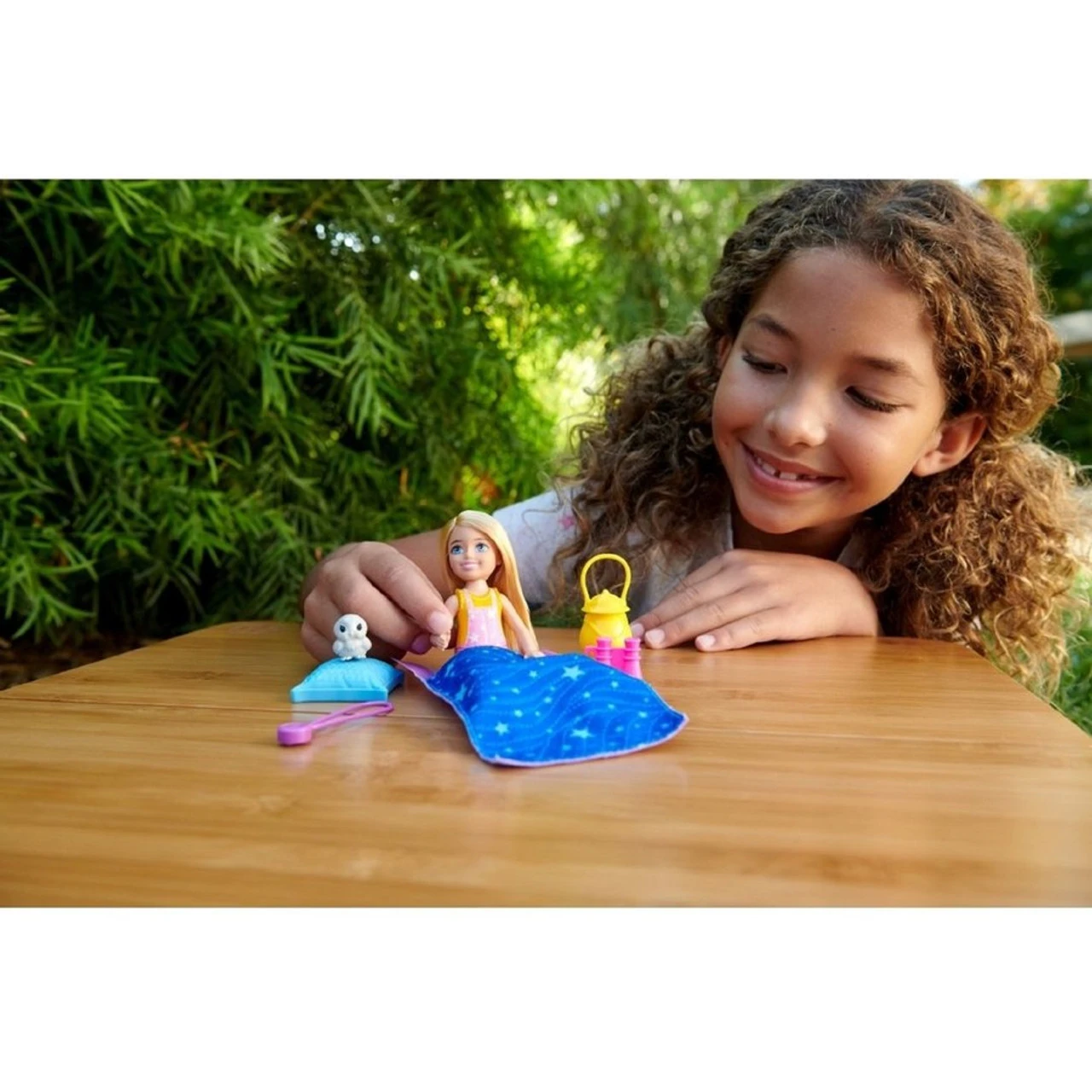 - After a day of adventuring, tuck Chelsea doll into her star-printed sleeping bag and stay cosy with a pillow and lantern accessory.