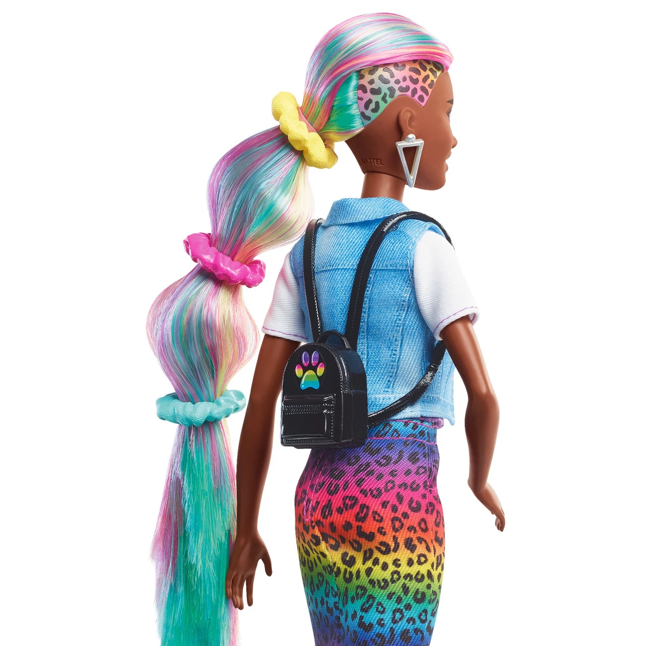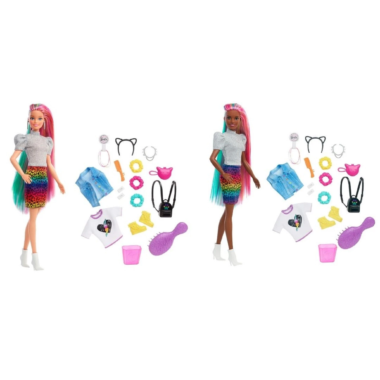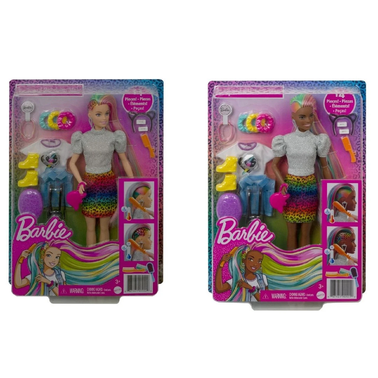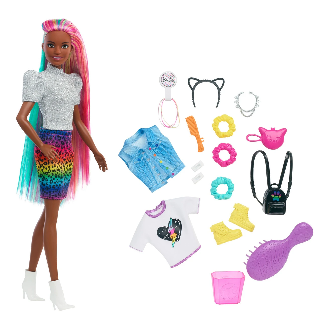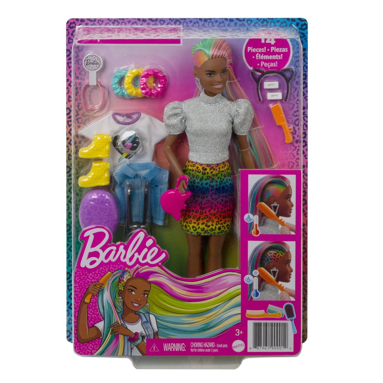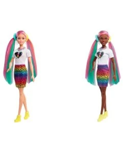 Barbie doll’s style has no limits and she loves exploring different colours and styles to find the perfect look! With the Barbie Leopard Rainbow Hair doll, kids can go ‘wild’ with her long rainbow-colored hair and brush it to the side to reveal a beautiful ombre rainbow look! For even more fun, they can activate the colour-change feature on the side by adding cold water and watch a leopard print appear! So cool! Barbie doll also comes with 16 hair and fashion play pieces to create multiple mix and match outfit combinations and all kinds of hairstyles including using scrunchies that work on Barbie doll’s hair. Barbie Leopard Rainbow Hair doll comes with these stylish items for fashion and hairstyling fun: 2 hair pins, 3 scrunchie bracelets (also work on Barbie doll’s hair), hair bands, a brush, a heart T-shirt, jean vest, cat ears, a cat purse, necklace, backpack, an extra pair of shoes, a sponge wand for the colour-change feature and a container for ice water. Kids will love the endless creative play and styling possibilities! Doll cannot stand alone. Colours and decorations vary. Makes a great gift for kids 3 to 7 years old. Explore a variety of imaginative styles and looks with the Barbie Leopard Rainbow Hair doll (30.40cm).Brush Barbie doll’s long rainbow-colored hair to the side to reveal a beautiful ombre rainbow look! Then activate the colour-change feature by adding cold water on the side and watch a leopard print appear! So cool! Create multiple mix and match outfit combinations and all kinds of hairstyles with 16 hair and fashion play pieces– including scrunchies that work on Barbie doll’s hair! Barbie Leopard Rainbow Hair doll comes with these super-stylish items perfect for young stylists and fashion fun: 2 hair pins, 3 scrunchie bracelets (also work on Barbie doll’s hair), hair bands, a brush, a heart T-shirt, jean vest, cat ears, a cat purse, necklace, backpack, an extra pair of shoes, a sponge wand for the colour-change feature and a container for ice water. Makes a great gift for kids 3 to 7 years old especially those who love exploring new looks, hairstyling and fashion! – Product Dimensions: Height: 29.8cm x Depth: 3.4cm x Width: 7.0cm – WARNING: CHOKING HAZARD. Small parts. Not suitable for children under 3 years.