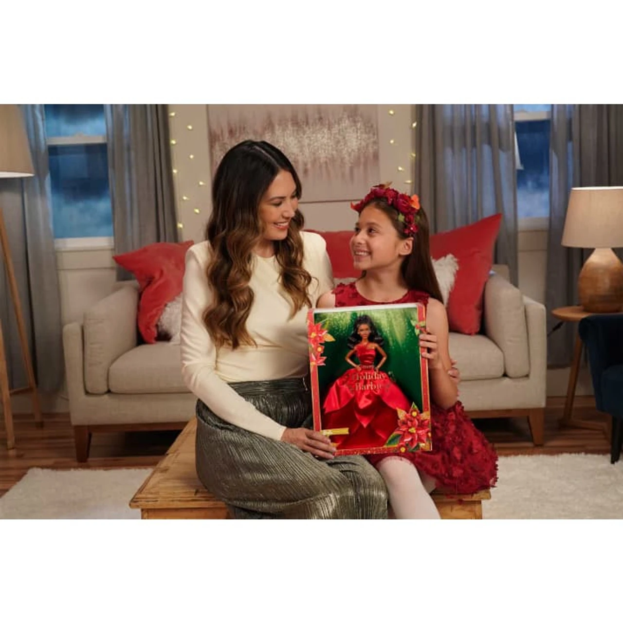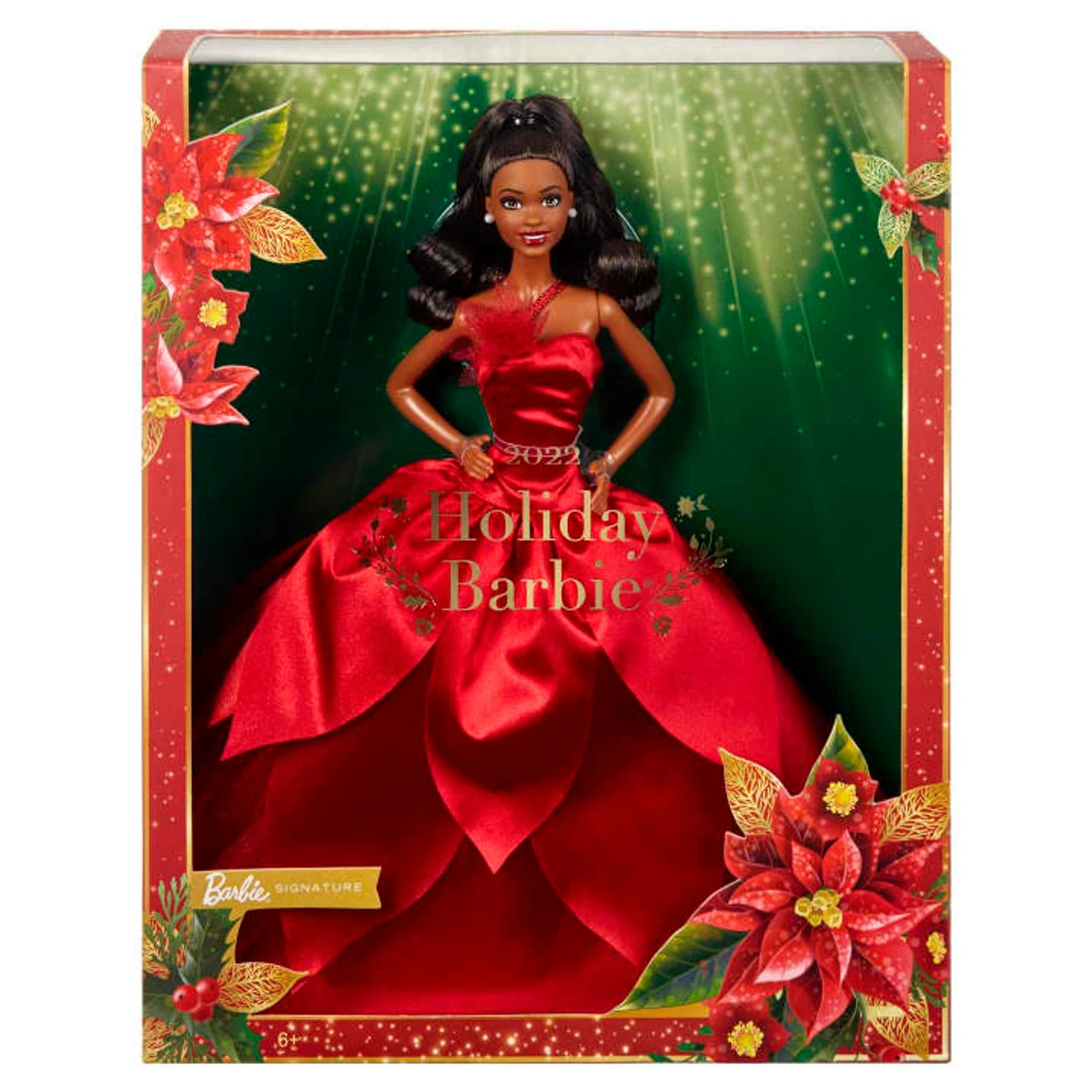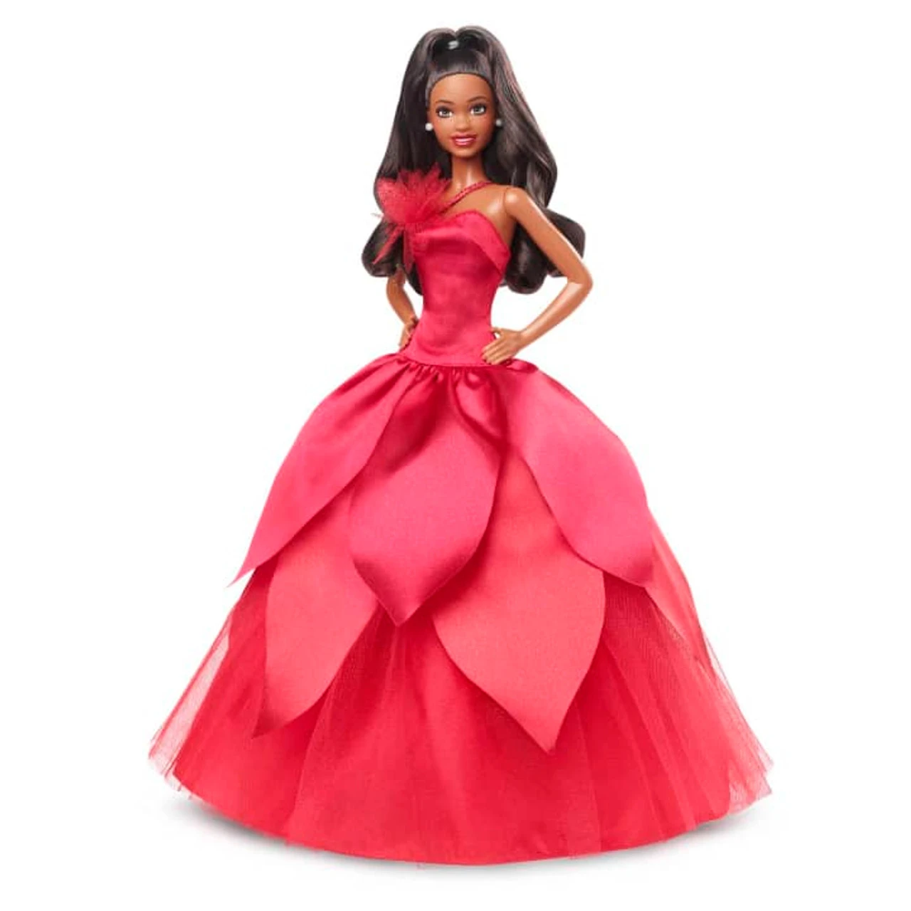 It’s the time of year for giving, gathering, and creating heartwarming memories that will last a lifetime. 2022 Holiday Barbie® Doll embodies the spirit of the season in a vibrant, red gown inspired by the beautiful poinsettia, a symbol of good will and community spirit. Her ensemble dazzles with a shimmering poinsettia detail at the neckline and a layer of tulle and satiny petals adorning her long, full skirt. Gorgeous, golden chandelier earrings and red lips complete her look. In packaging that’s ideal for display, this collectible 2022 Holiday Barbie® doll makes a great gift for 6 year olds and up. Includes doll stand and Certificate of Authenticity. Doll cannot stand alone. Colours and decorations may vary. 2022 Holiday Barbie® Doll embodies the spirit of the season in a vibrant, red gown inspired by the poinsettia, a symbol of good will and community spirit. Her elegant dress dazzles with a beautiful poinsettia detail at the neckline and a full, floor-length skirt adorned with a layer of tulle and satiny petals. Gorgeous, golden chandelier earrings and red lips complete her look. Barbie® doll wears her long, dark-brown waves in a sophisticated ponytail. In packaging that’s ideal for display, 2022 Holiday Barbie® doll makes a great gift for collectors and kids ages 6 years old and up.