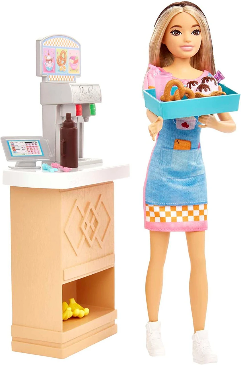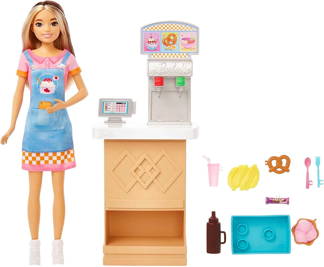- The Barbie set features Skipper doll in her onscreen-inspired uniform, a snack counter with soft-serve machine and register, a colour-change sundae, and 8 additional storytelling accessories.