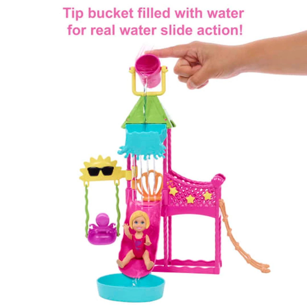 - The Barbie® set features Skipper doll in her onscreen-inspired uniform, a toddler small doll, the multi-level waterpark, a puppy squirt toy, and 5+ accessories.