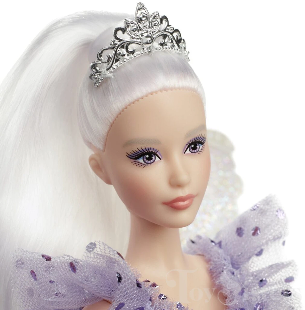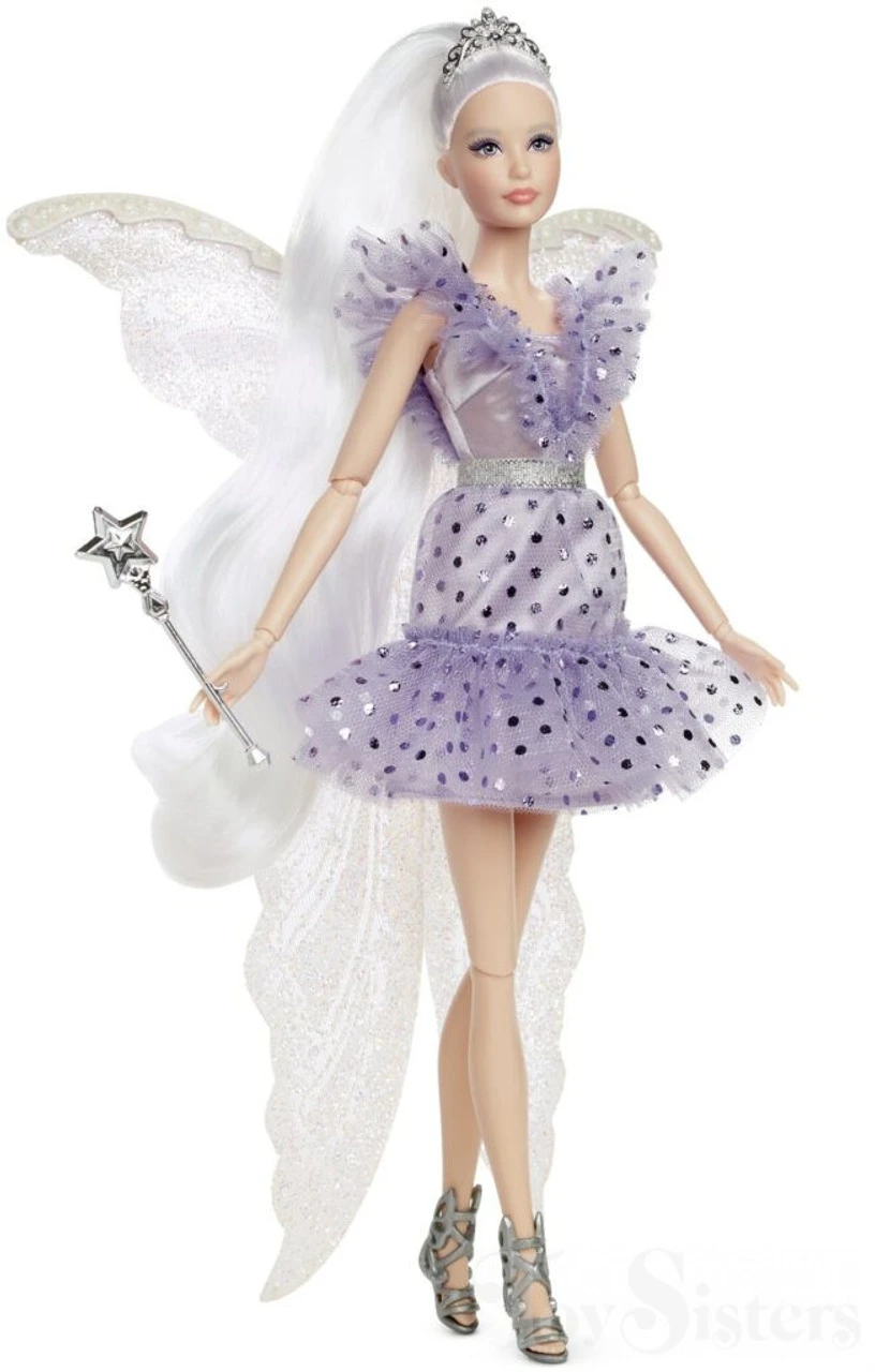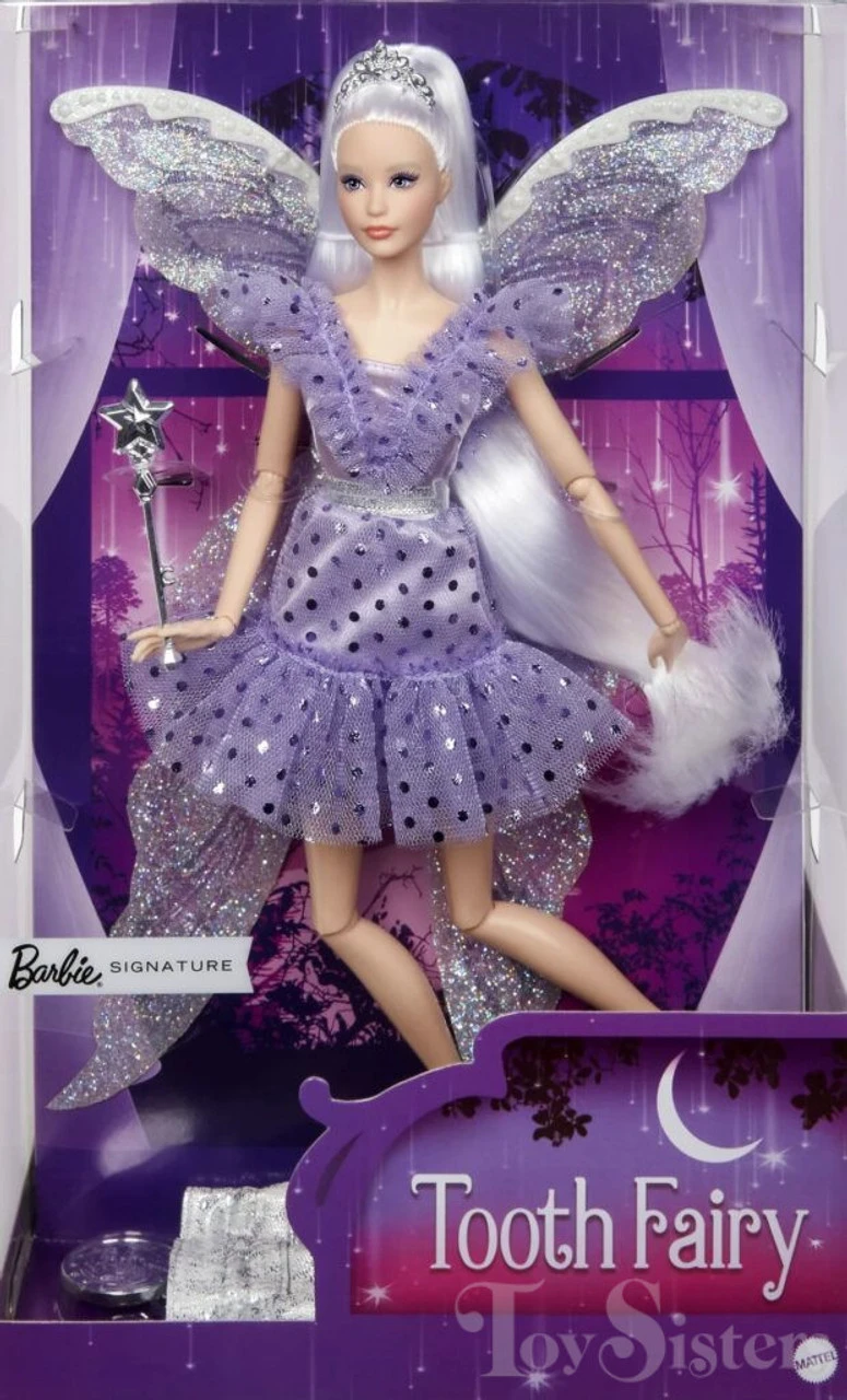 A visit from the tooth fairy is a magical milestone. This collectible Barbie doll commemorates the sweet moment with a fantastical look and accessories. Barbie Tooth Fairy doll wears a pretty, periwinkle dress featuring fluttery ruffles, sparkling polka dots and a beaded belt. Her look is complete with shimmery fairy wings, a silvery wand and a gemstone-encrusted tiara in her whimsical white hair. With a shimmering bag of silvery coins and packaging featuring space to write a personalised message, Barbie Tooth Fairy doll makes the perfect gift to celebrate such a special day. Includes doll stand and Certificate of Authenticity. Doll cannot stand alone. Colours and decorations may vary. Key Features: Commemorate a magical milestone with Barbie Tooth Fairy doll! Barbie Tooth Fairy doll celebrates a special childhood moment in a pretty, periwinkle dress featuring fluttery ruffles, sparkling polka dots and a beaded belt. Her look is complete with shimmery fairy wings, a silvery wand and a gemstone-encrusted tiara in her whimsical white hair. Complete the sweet experience with a shimmering drawstring bag that opens to reveal silvery fairy coins! With packaging featuring space to write a personalised message, Barbie Tooth Fairy doll makes the perfect gift to celebrate this special day.