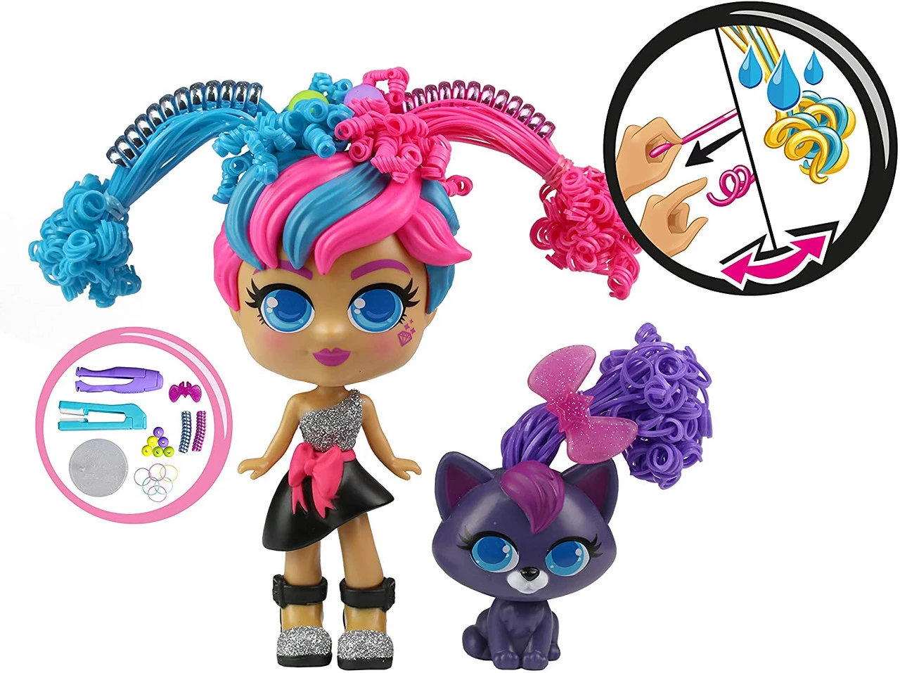 - Each doll features colourful patented Magicurl hair, you can stretch the hair to create amazing, tight curls and style with cute hair accessories to get the look you want