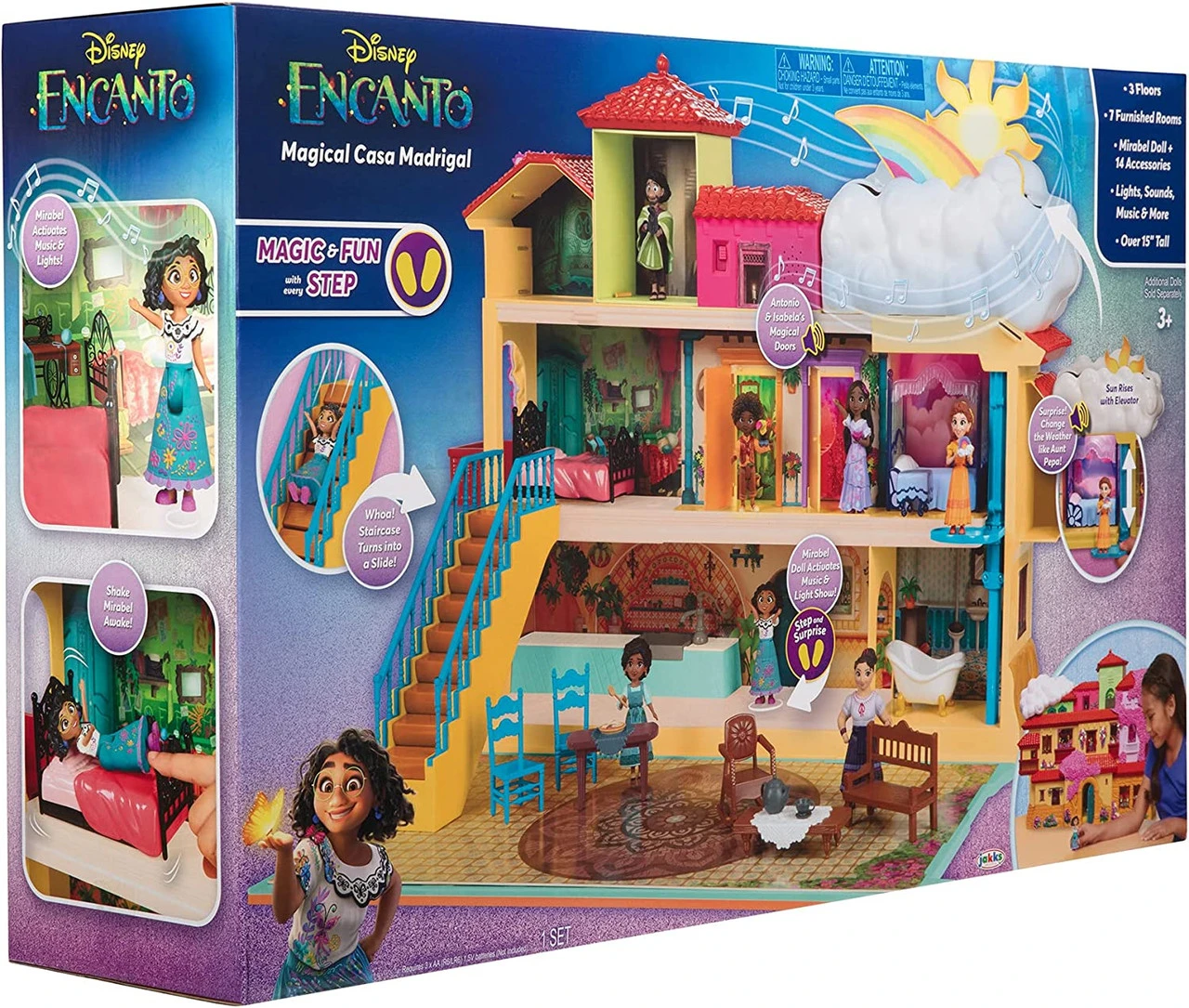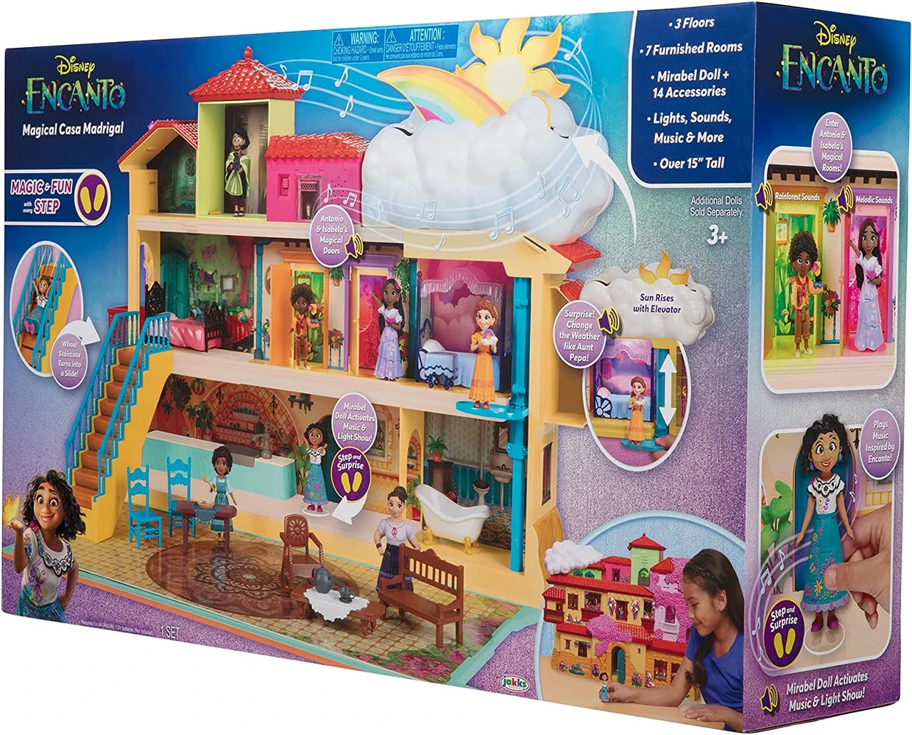 Walt Disney Animation Studios 60th feature, Encanto, tells the tale of an extraordinary family, the Madrigals, who live hidden in the mountains of Colombia, in a magical house, in a vibrant town, in a wondrous, charmed place called an Encanto. The magic of the Encanto has blessed every child in the family with a unique gift from super strength to the power to healevery child except one, Mirabel. But when she discovers that the magic surrounding the Encanto is in danger, Mirabel decides that she, the only ordinary Madrigal, might just be her exceptional familys last hope.Journey into the Magical Casa Madrigal from Disneys Encanto, and bring the magical gifts of the Madrigal family to life! Designed to be just like the vast and extraordinary Casita, this playset includes lights, sounds, and movement features, and stands over 15 inches tall, unfolding to reveal 3 floors with 7 furnished rooms! Step and Surprise! When the included Mirabel doll is placed in her unique footprint area, a lively music and light celebration plays throughout the entire Casa Madrigal! Just like in the movie, play out changing the weather like Aunt Pepa with the feature elevator! Lift the elevator to see a sunshine and rainbow appear above the clouds and reveal colorful lights and the sounds of birds chirping. Lower the elevator, and the sunshine and rainbow disappear, triggering thunderstorm sounds, and lighting-like flickering lights. The enchanted Casita loves to play with Mirabel! Place the Mirabel doll on the staircase, and it transforms into a surprise slide that she glides down! So much fun! Visit Mirabels charming bedroom for more magical surprises. Place Mirabel on the button on the floor of her room to hear her sing music and see lights! Upstairs, there are Mirabels sister, Isabela, and cousin, Antonios magical doors to discover! Open these golden doors, that look just like their doors in the film, to reveal lights and sounds coming from Isabelas garden and Antonios rainforest.Decorate the Magical Casa Madrigal with 15 house accessories, including beds, tables, and chairs, and play out your favorite story scenes with the included Mirabel doll. The Magical Casa Madrigal also includes Uncle Brunos mysterious tower, Julietas kitchen, a grand courtyard, and a bathroom. With the Magical Casa Madrigal, you’ll have hours of fun playing out your favorite movie moments from Disneys Encanto!