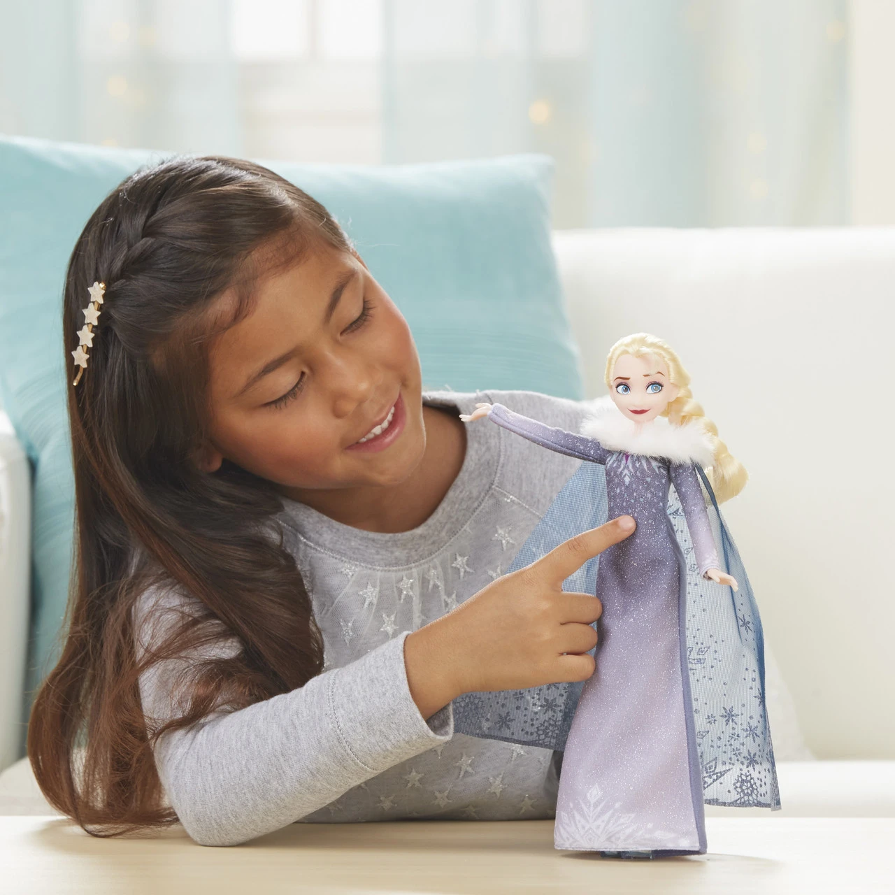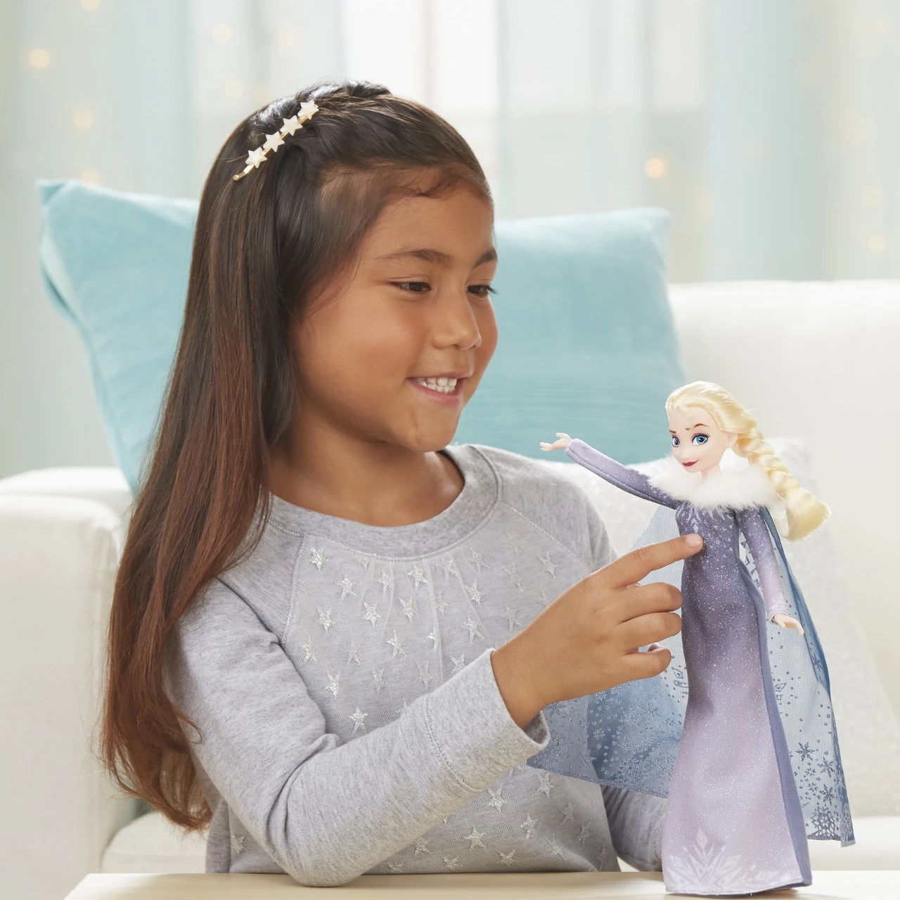Elsa sings about the joy of celebrating the holidays together! With a style inspired by the Disney animated short film event, Olaf’s Frozen Adventure, this Elsa doll features a shimmery silver dress and a matching pair of shoes. Little dreamers can sing along with Elsa to the song, “When We’re Together.” Press the button on her stomach to hear her sing and discover the true meaning of the holiday season through song!; Copyright Disney.; Hasbro and all related terms are trademarks of Hasbro.;