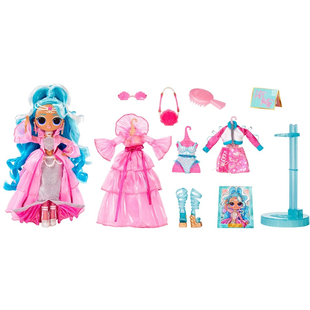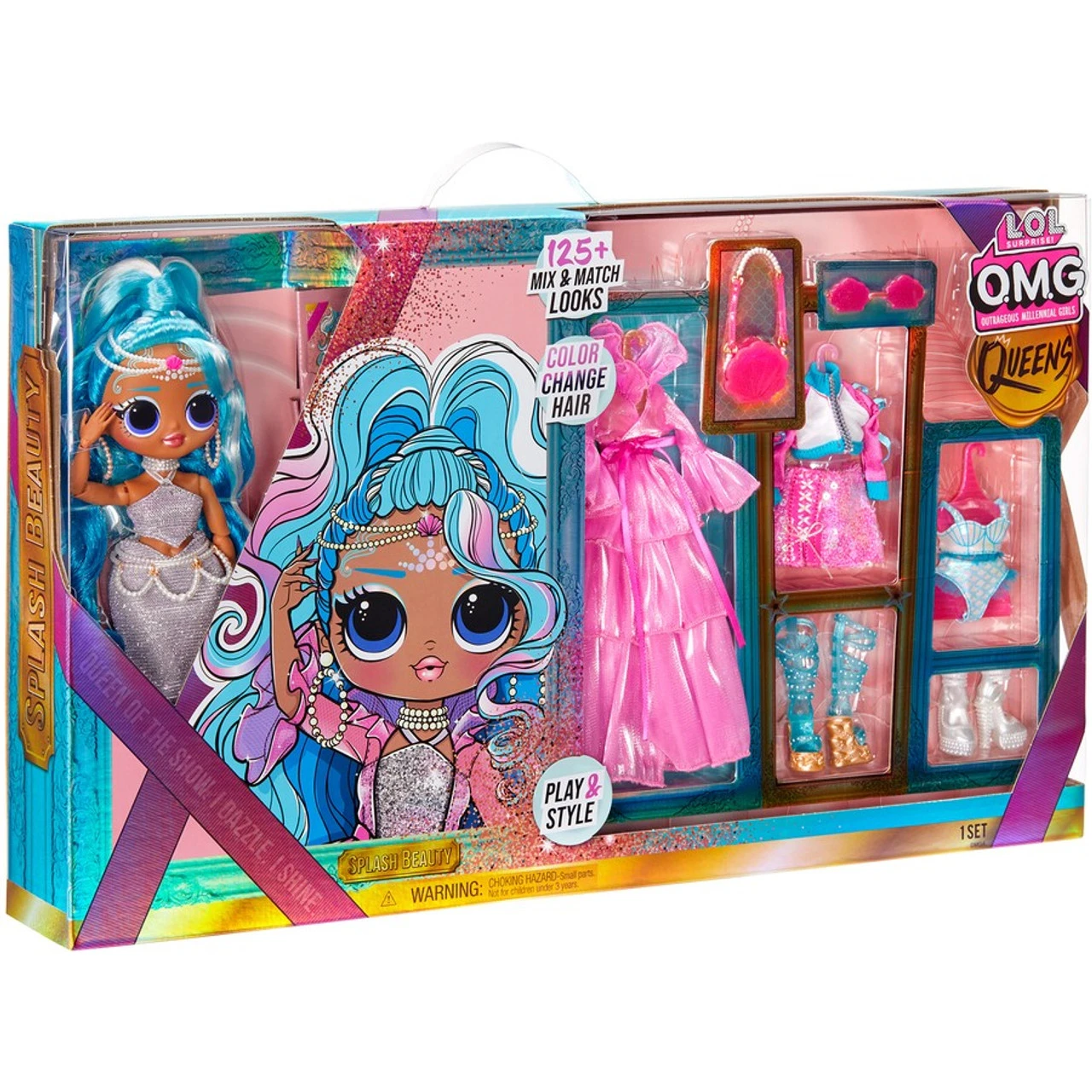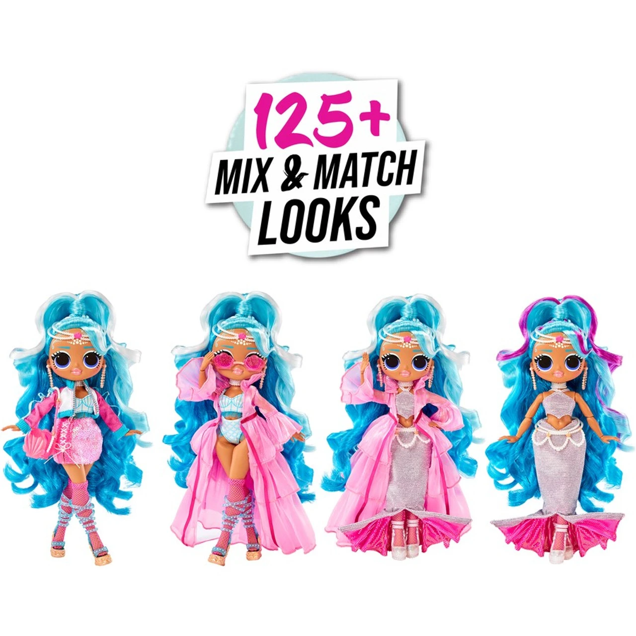 - CREATE 125+ MIX & MATCH FASHION LOOKS with LOL Surprise OMG Queens fashion doll Splash Beauty including sparkling fashions and royal themed accessories like her mermaid skirt, long pink coat, necklace, 2-piece swimsuit and headband.