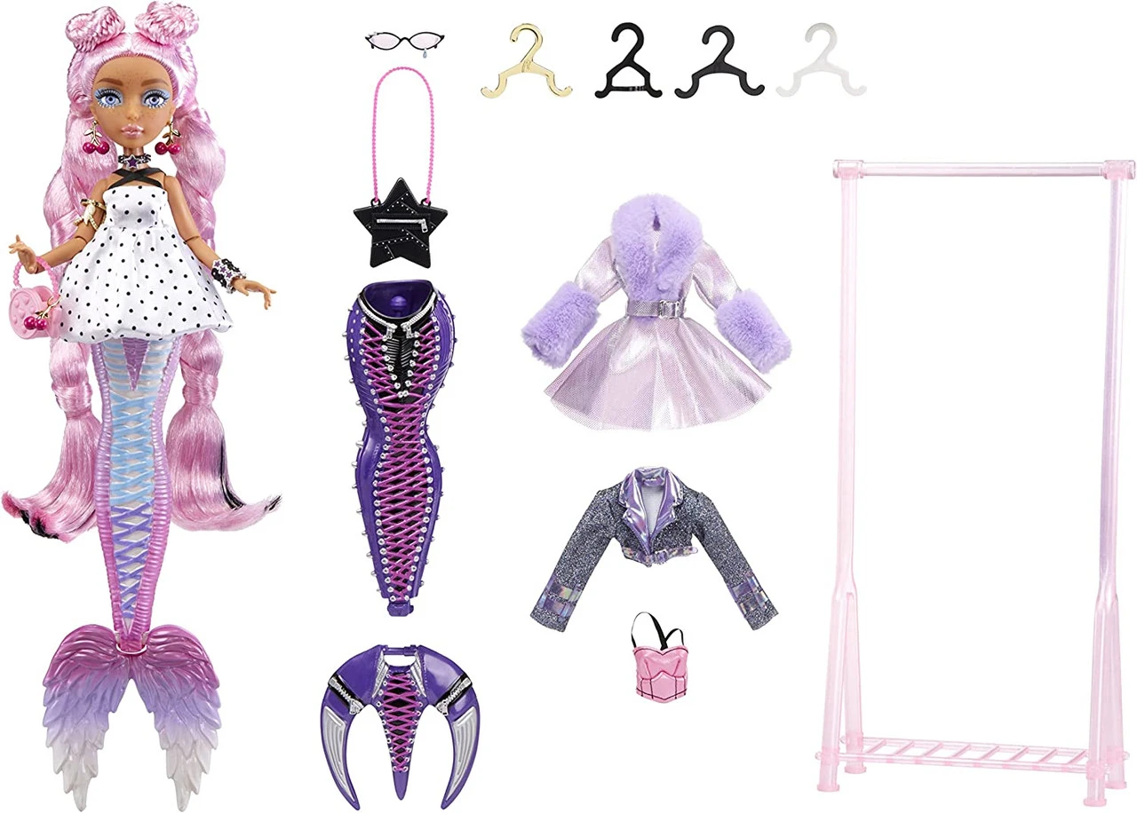 - INCLUDES: 1 Articulated mermaid fashion doll with 2 hair colours in one, 2 interchangeable mix and match sculpted tails and fins, 1 dress, 2 jackets, 1 top, 2 purses, 1 pair of glasses, 1 pair of earrings, 1 bracelet, 1 arm cuff, 4 hangers and 1 clothing rack.