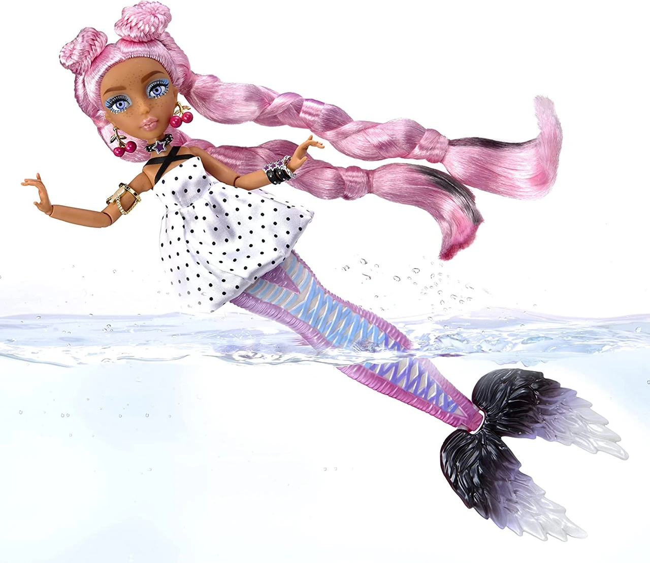 Beyond the waves, beneath the surf, into the deep blue… follow the fabulous fins of Mermaze Mermaidz to discover something amazing! Morra is mysterious and unexpected– she navigates her unique shapeshifting powers in the form of different looks. Morra likes to dress sweet, salty, or a mix of both! Morra has two unique, interchangeable sculpted tails and fins, assorted fashions, accessories and a clothing rack to display it all. Her hair comes styled in pink braids, but once you unravel it, you’ll find black streaks underneath to create endless fun hairstyles. Her “sweet” fin and eye makeup also perform a dramatic colour change when submerged in ice cold water. Watch her fin transform from ombre pink and silver to stunning black, and her eyeshadow from blue to black with stars that appear under her eyes. Her tails double as stands when the fin is bent and she leans forward slightly, so she can really stand on her own! Morra has articulation points at the neck, shoulders, elbows, wrists, torso, waist and fin. There are so many poses to create! Morra comes with 2 tails, 2 fins, 1 dress, 1 top, 1 trench coat, 1 jacket, 2 purses, 1 pair of glasses, 1 pair of earrings, 1 bracelet, 1 arm cuff and 1 clothing rack to create so many mermazing looks. Morra has gorgeous glass inset eyes and real eyelashes, as well as glamorous makeup complete with blue eyeshadow. Perfect for play in and out of water! Note: The doll’s hair may not appear the same after being submerged in water.