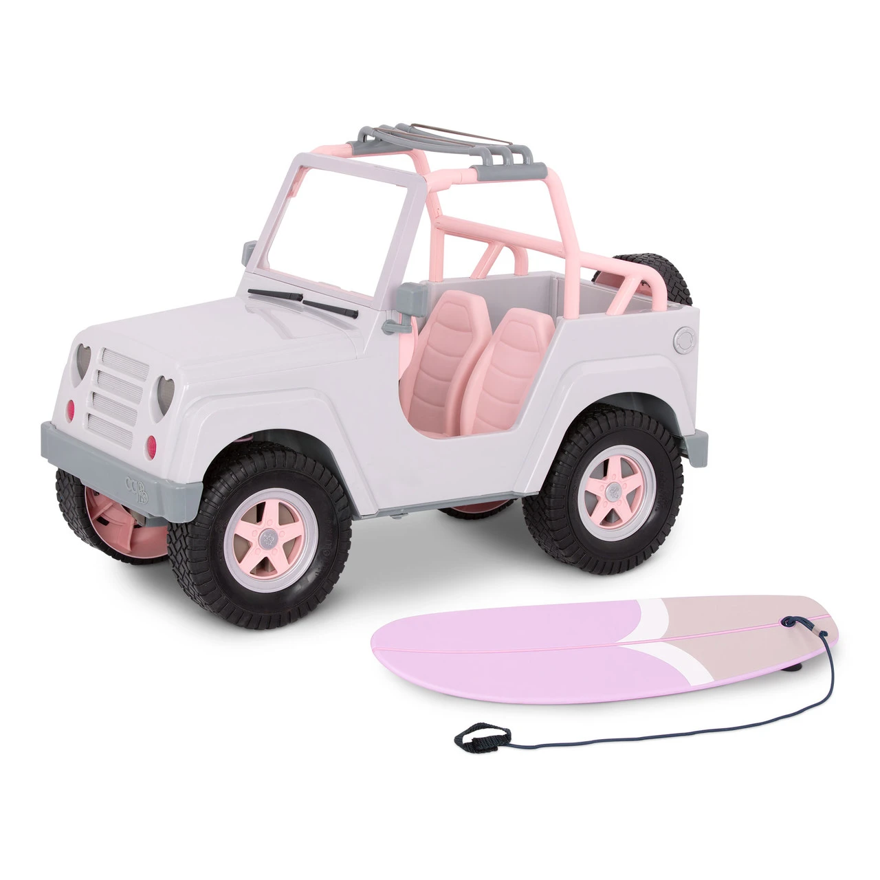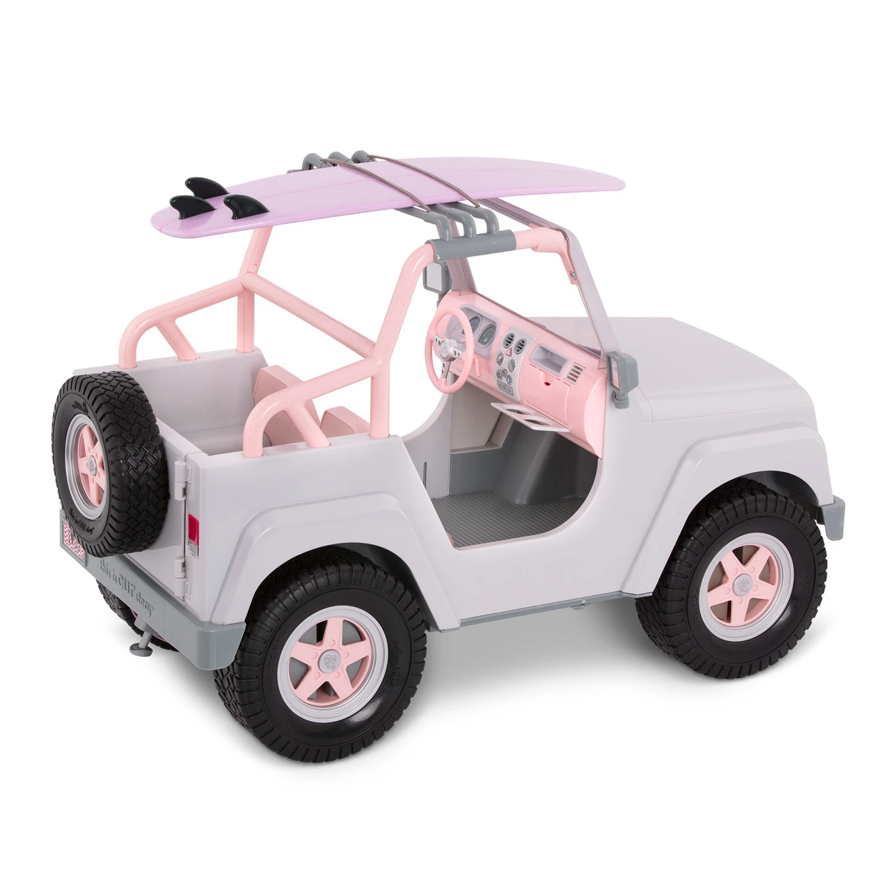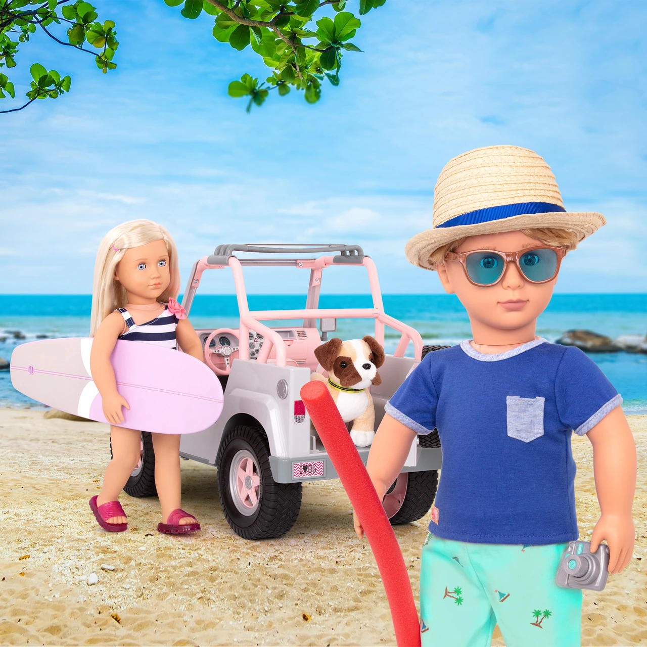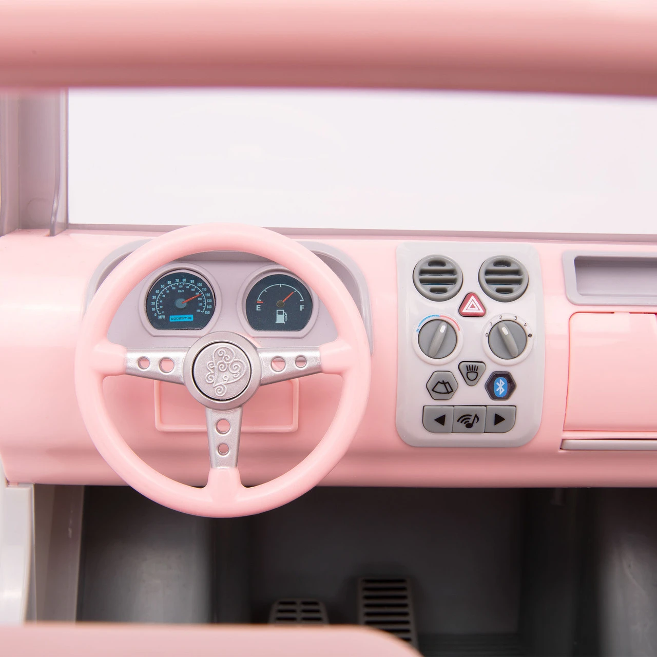 Take the sweetest trips with your 18-inch dolls in the Our Generation Off Roader 4×4! This durable, stylish, light-grey vehicle is perfect for taking your BFFs on fun adventures – best furry friends, too! The Off Roader comfortably fits two 18-inch dolls, with their loyal pals sitting happily in the back. No road trip is complete without a great soundtrack! This Our Generation vehicle has a built-in Bluetooth speaker, so your besties can listen to their favourite tunes as they cruise! Where are you traveling to today? Turn the steering wheel to activate the signal lights, make the wipers “swoosh” when it starts to drizzle, and switch on the headlights during nighttime trips. Beep! Beep! Fun and adventure are just around the corner!