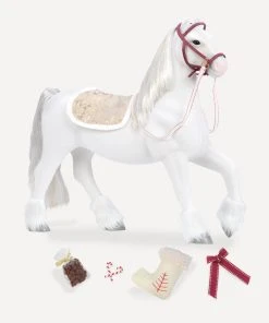 Dash through the snow on this beautiful 20-inch toy horse! Gallop through the snow or dash, it’s up to you! Dashing through the snow with your favourite 18-inch dolls is more fun when you have a beautiful horse to help you, like the 20-inch Our Generation White Clydesdale Horse! Because our generation of girls is filled with warmth, even when the chill in the air is biting our noses. We’re learning what’s truly important in this world. We’re raking leaves to earn spending money, shovelling out a neighbour in need, and even volunteering at school to turn the cafeteria into a winter wonderland worth celebrating. This is our time. This is our story. Holiday Accessories for 18-inch Dolls! A beautiful horse friend to share your sparkling holiday moments! This shimmering white 20-inch toy horse is the perfect equestrian friend for your dolls. Let your dolls ride on its back, or use the horse to pull a winter sleigh! The Clydesdale horse has beautiful nylon hair that is fun to brush and style. It comes with four fluffy, faux-fur horse booties, a red ribbon to decorate with, a brocade-fabric saddle blanket, and lots of adorable holiday accessories to share with your dolls!
