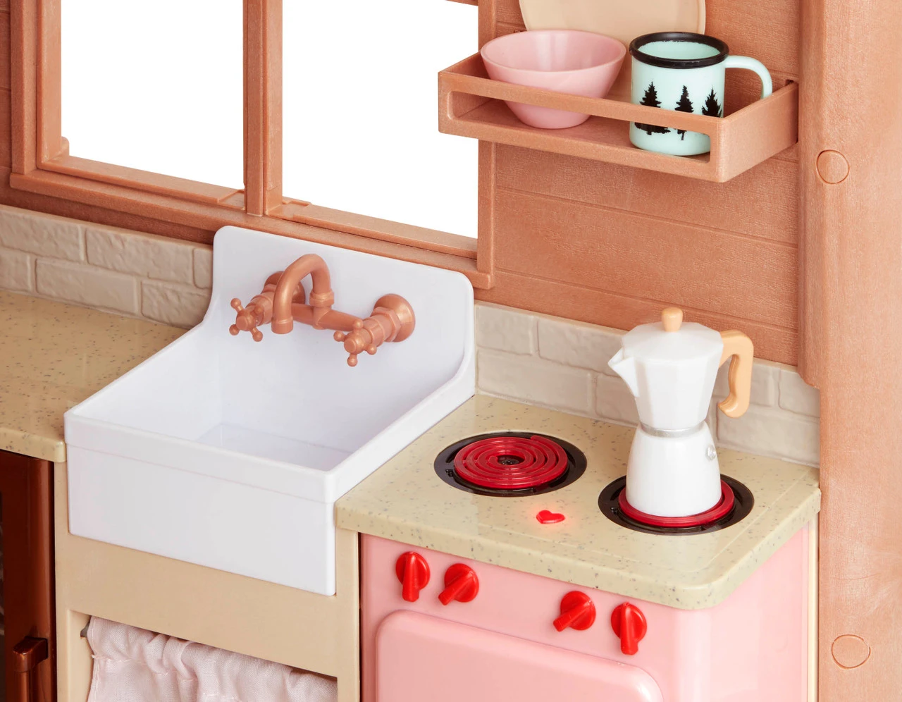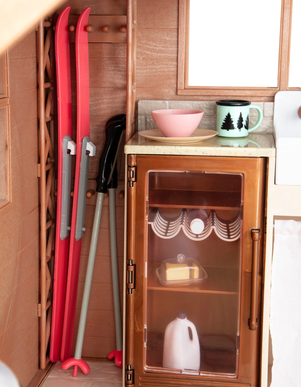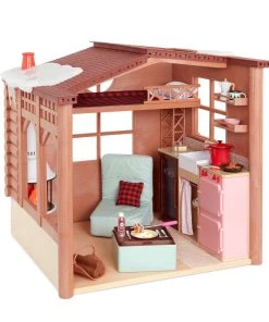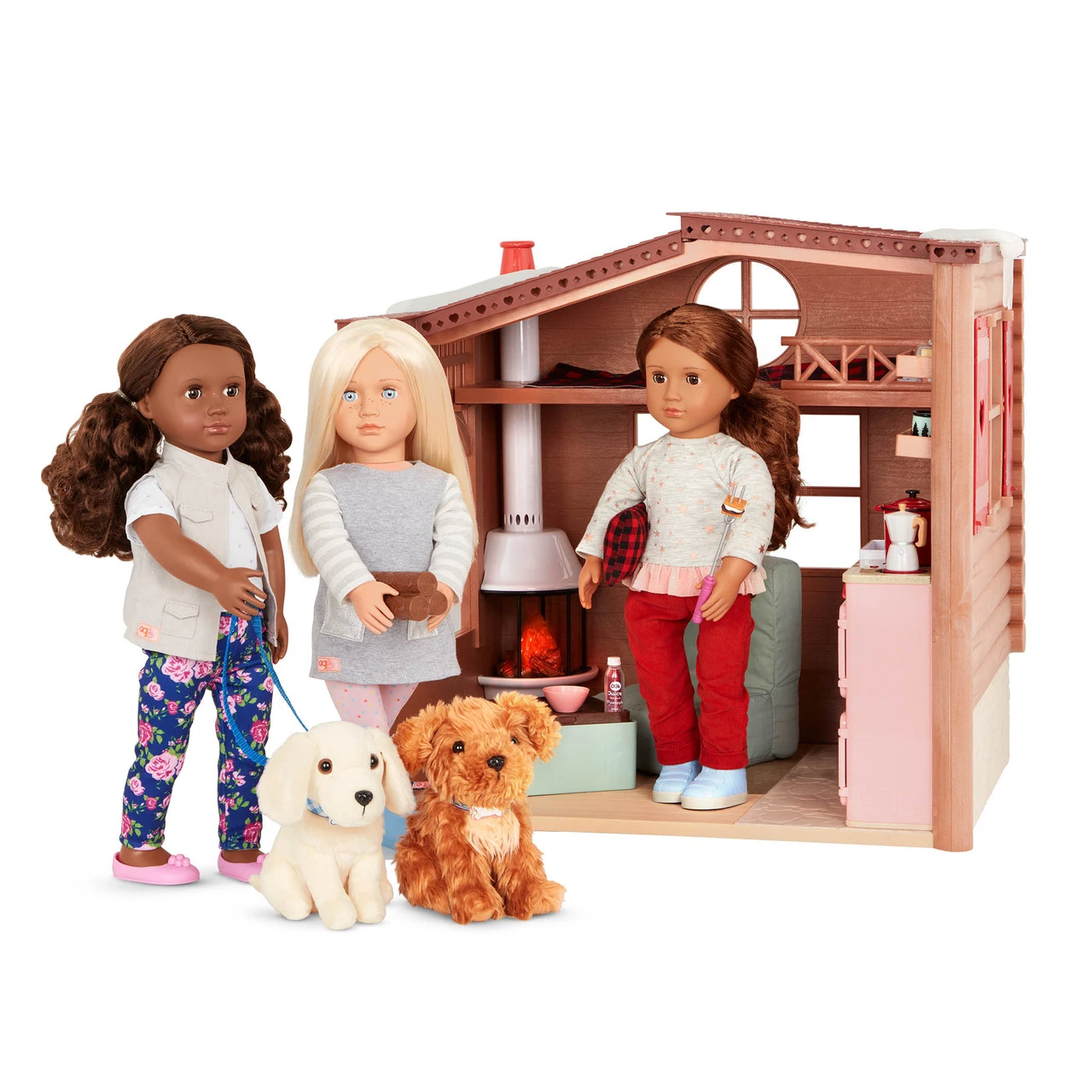 Host holiday celebrations in the Our Generation Cozy Cabin! This open dollhouse playset has decorative snow on the roof, opening window shutters, and realistic details so your 18-inch dolls can enjoy endless festive fun! Invite your besties over for toasty hot chocolate and delicious meals as you “heat” them up on the cooking stove – the burners light up when you turn the dials! Store the milk jug, butter, and juice bottle in the mini fridge, and keep the mug, plates, and cooking accessories always in reach on the storage shelves above the stove. S’mores time! Set your meals down on the food tray and sit in front of the fireplace to roast yummy marshmallows – it’s the perfect snack to prepare on snowy nights! Light up the fireplace and listen to the sounds when you press the button, and keep the fire going with the pack of logs as you read your favourite holiday stories. Then snuggle up with the cozy blanket and prepare for a night of sweet dreams!