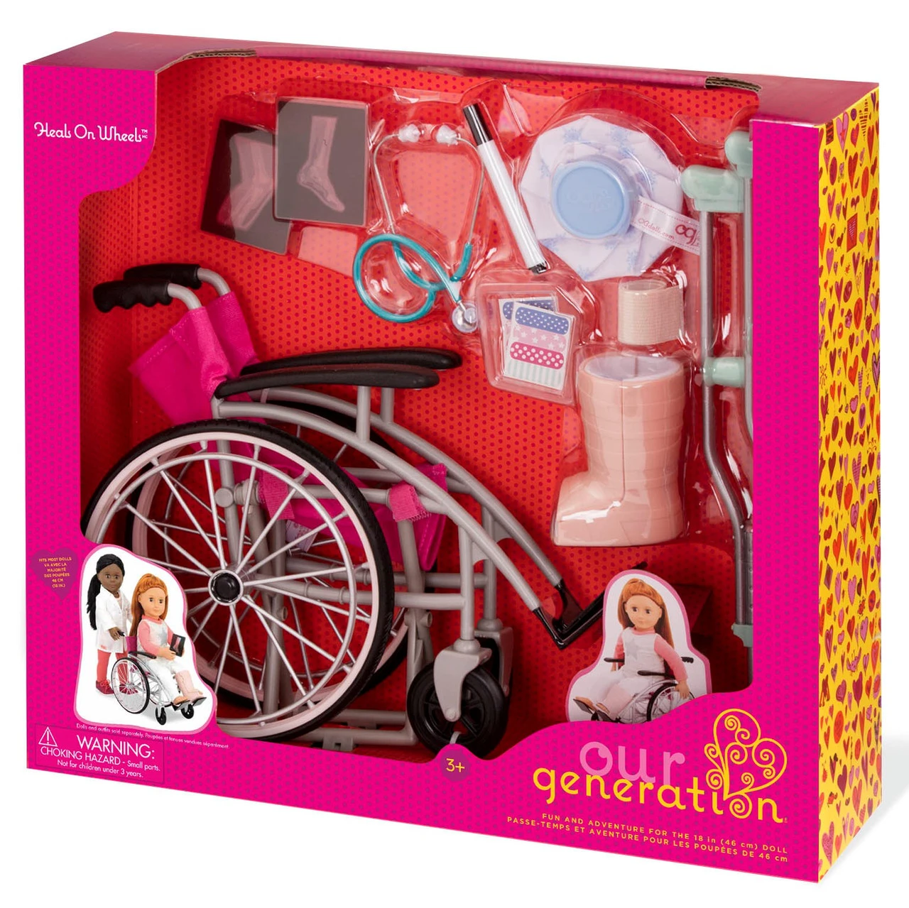Love is the best medicine, but even dolls need the right tools to help them recover. Give them all the essentials for good health with the Our Generation Heals on Wheels Wheelchair Set for 18-inch dolls!