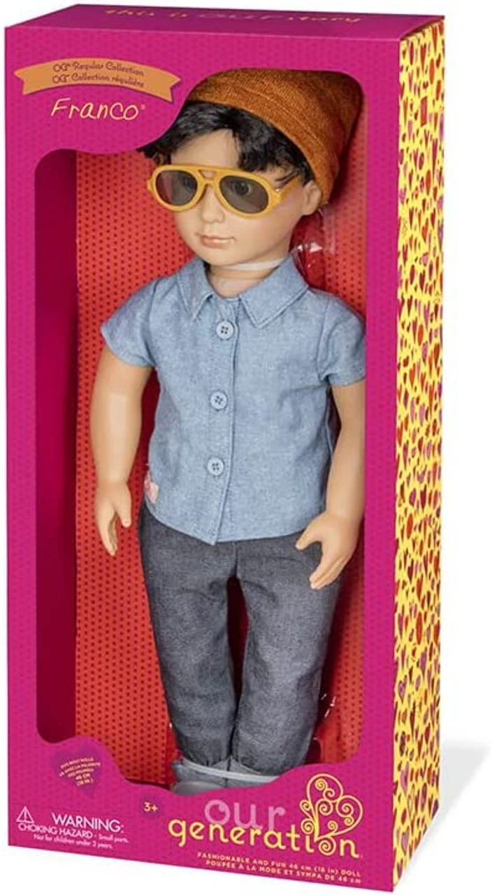 Have you met the new Our Generation boy doll – Franco? This 18-inch youngster just moved to the neighbourhood, and he’s ready for an adventure! Franco is non-posable 18 inch doll with black hair and brown eyes.