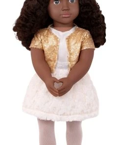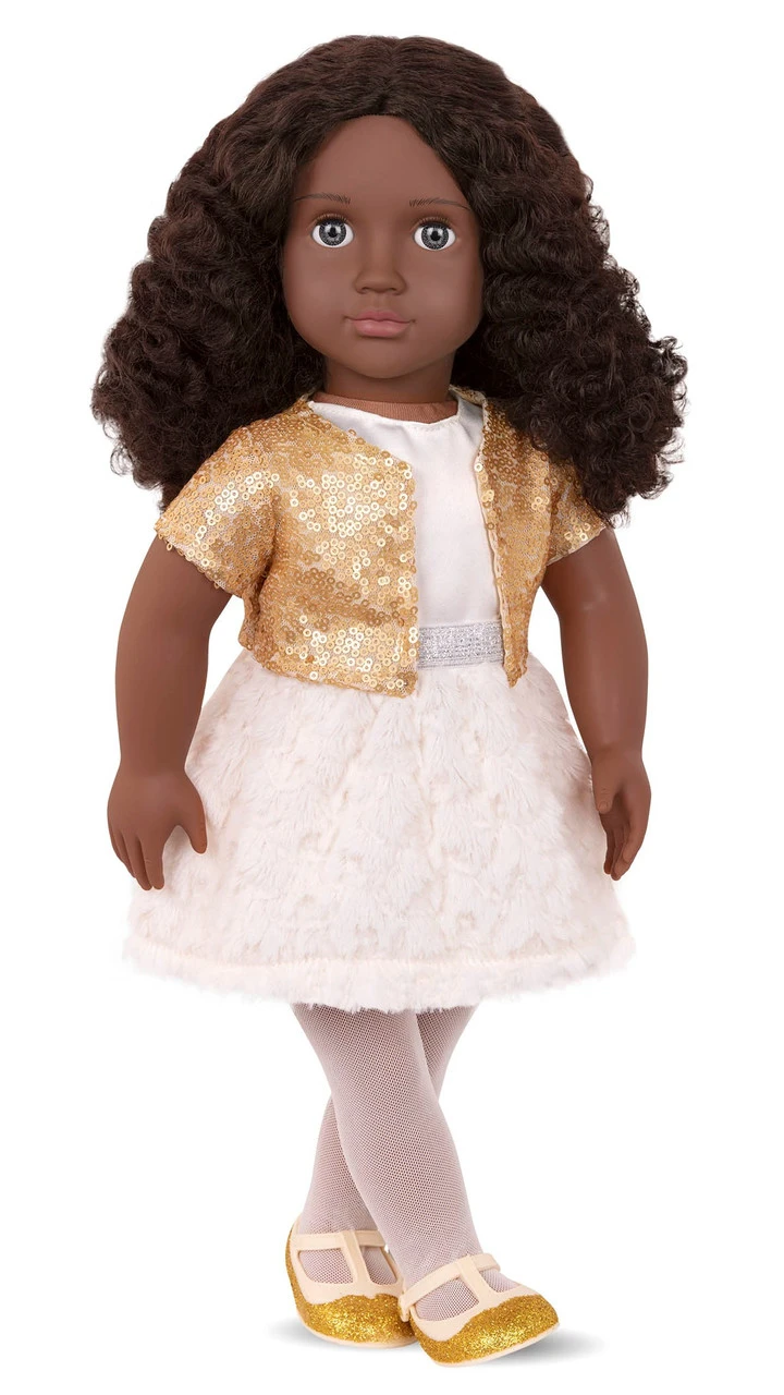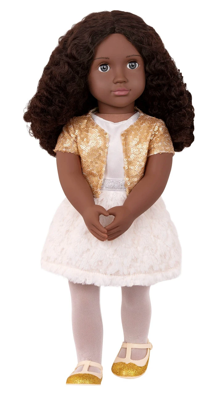 Put a holiday twinkle in your eye and some seasonal sparkle in your step with Our Generation Regular 18-inch Holiday Doll – Haven, a beautiful non-posable doll with long, curly brown hair and unique gray eyes. Celebrating the holidays is what Haven does best, and she loves spending the festive time of year with her friends and family!