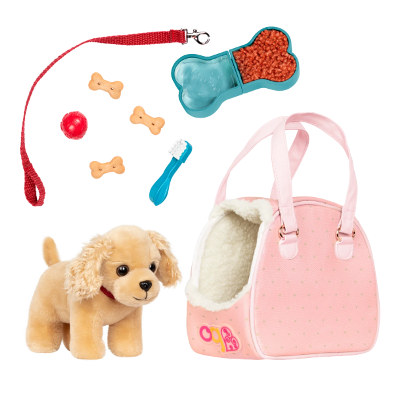 - Dog carrier with plush puppy for 18-inch dollsPet pup comfortably fits inside the dog carrier when traveling on adventuresLeash fits around Our Generation doll’s hand and easily clips to dog collar to take your pup on fun walksIncludes: dog carrier, 6-inch pup with collar, leash, water and food bowl, toy ball, 3 treats, and toothbrushCompatible with most 18-inch dolls, plush pets, and accessoriesSuggested for ages 3+ (small parts)No batteries requiredDolls sold separately