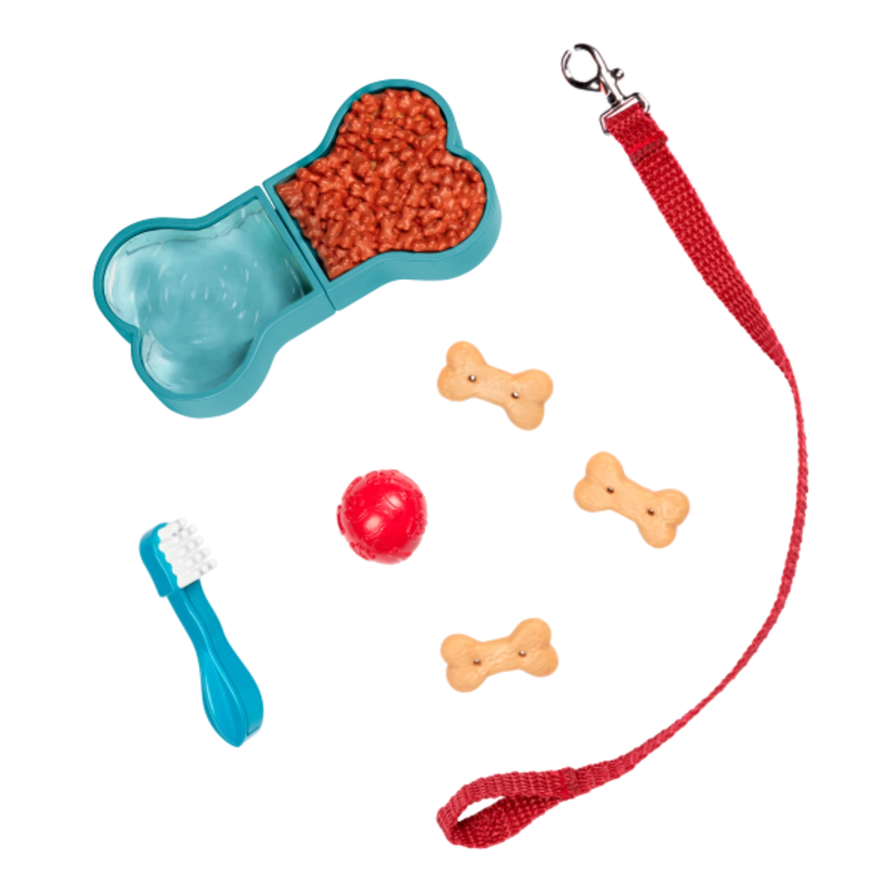 1 dog carrier1 6-inch dog plush with collar1 leash1 water & food bowl1 toy ball3 dog treats1 dog toothbrushDolls sold separately