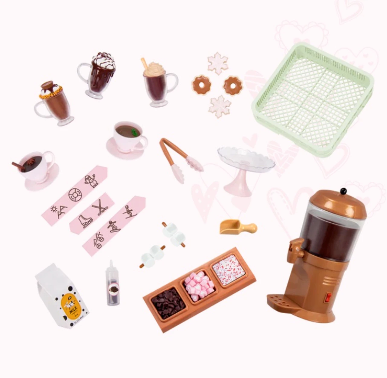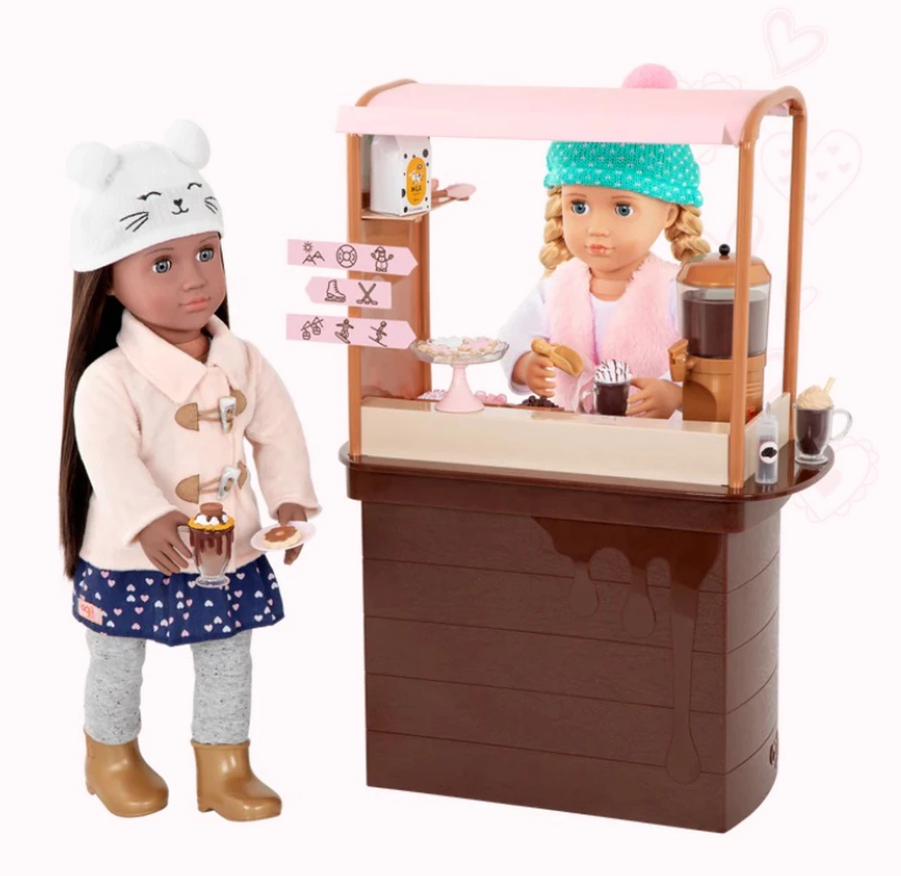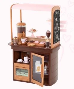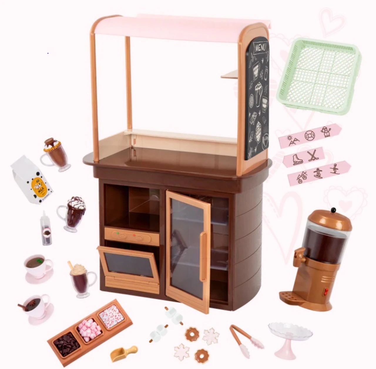 Now you can enjoy sweet treats with your best friends at the Our Generation Choco-tastic Hot Chocolate Stand! Choose a yummy dessert from the menu board and get ready to serve your customers with a smile. Prepare 5 different cups of hot chocolate with the hot chocolate machine, then use the scooper to decorate each cup with marshmallows, chocolate, and sprinkles from the toppings tray – confection perfection! Would you like a side of cookies? Place the delicious sugar cookies on the display plate and put them out on the counter. Then use the tongs to hand them out to your friends. Are they up for a day of activities? Easily clip the 3 activity signs to the chocolate stand and follow the paths for a fun adventure! They can choose between ice skating, snow tubing, or enjoy a ride on a ski lift. But hurry back for a serving of tasty marshmallow sticks! FEATURES: Contents: 1 hot chocolate stand, 1 hot chocolate machine, 1 topping tray with 3 flavors, 1 scooper, 2 marshmallow sticks, 2 cups of hot chocolate with saucers, 3 mugs of hot chocolate, 4 cookies, 1 milk carton, 3 activity signs, 1 tray with stand Also includes: 1 pair of tongs, 1 chocolate bottle and 1 dishwasher tray Realistic details for more pretend-play fun Compatible with most 46cm dolls and accessories Toasty treats for you and me! Dolls and outfits sold separately
