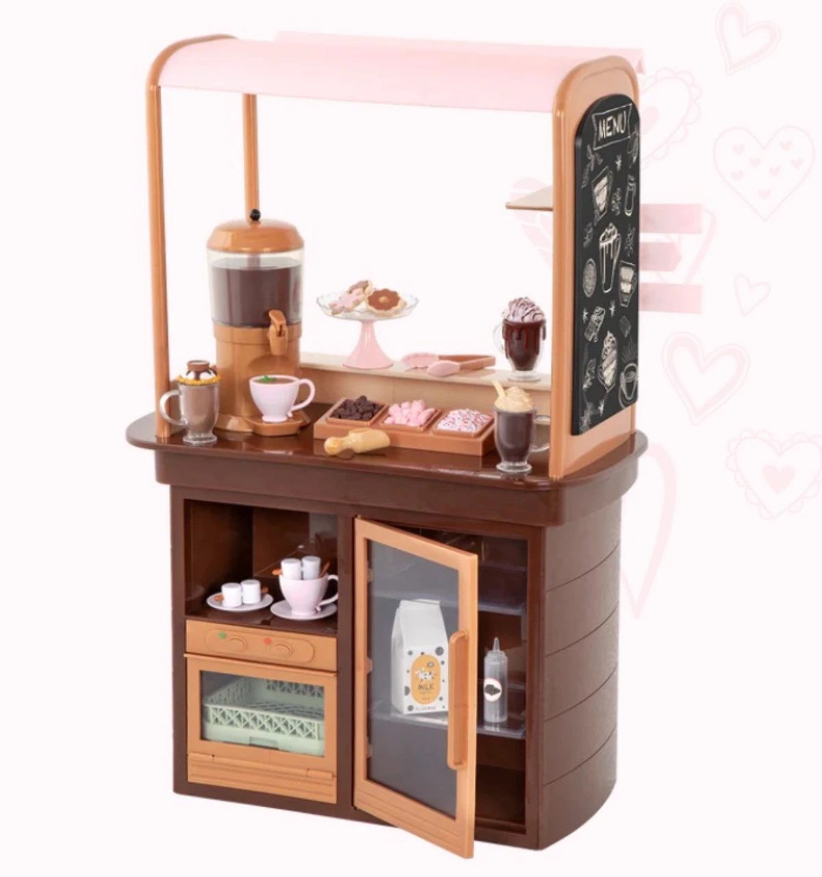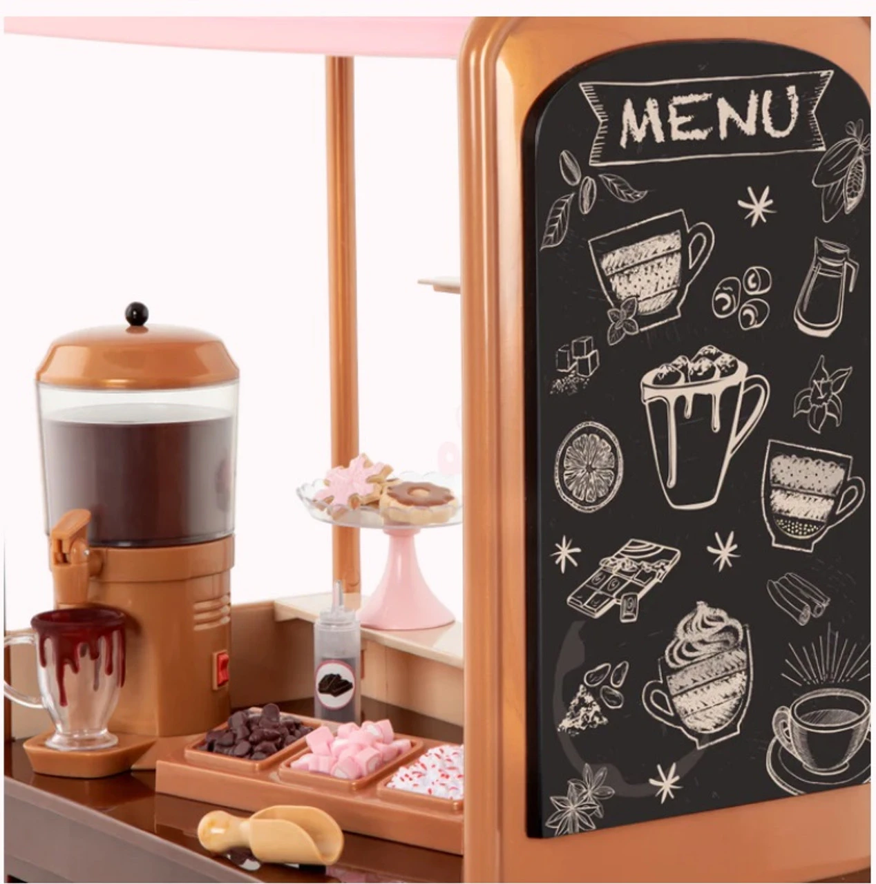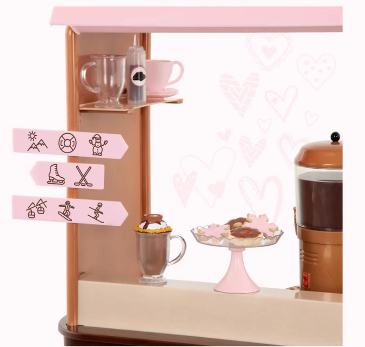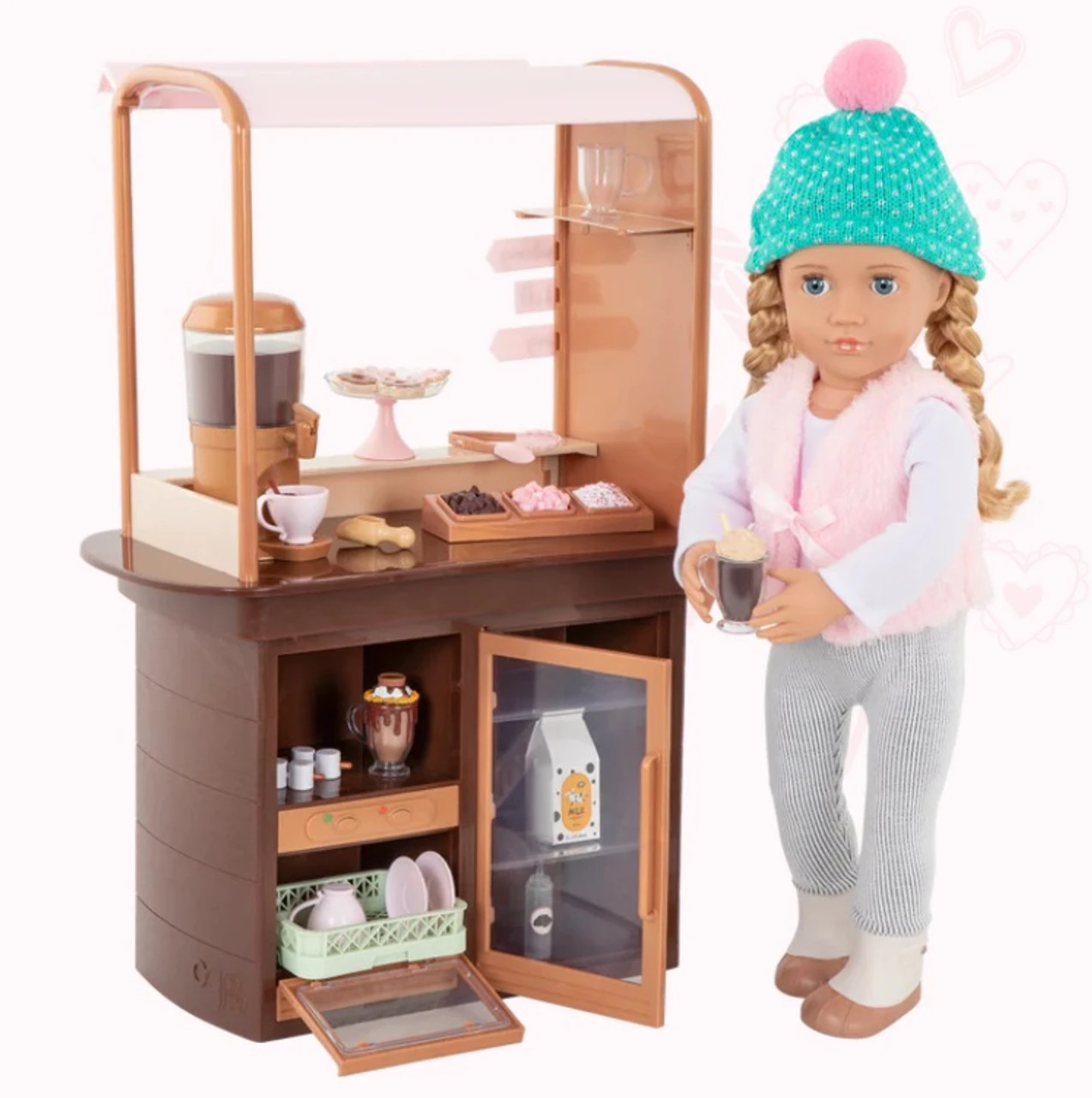 Now you can enjoy sweet treats with your best friends at the Our Generation Choco-tastic Hot Chocolate Stand! Choose a yummy dessert from the menu board and get ready to serve your customers with a smile. Prepare 5 different cups of hot chocolate with the hot chocolate machine, then use the scooper to decorate each cup with marshmallows, chocolate, and sprinkles from the toppings tray – confection perfection! Would you like a side of cookies? Place the delicious sugar cookies on the display plate and put them out on the counter. Then use the tongs to hand them out to your friends. Are they up for a day of activities? Easily clip the 3 activity signs to the chocolate stand and follow the paths for a fun adventure! They can choose between ice skating, snow tubing, or enjoy a ride on a ski lift. But hurry back for a serving of tasty marshmallow sticks! FEATURES: Contents: 1 hot chocolate stand, 1 hot chocolate machine, 1 topping tray with 3 flavors, 1 scooper, 2 marshmallow sticks, 2 cups of hot chocolate with saucers, 3 mugs of hot chocolate, 4 cookies, 1 milk carton, 3 activity signs, 1 tray with stand Also includes: 1 pair of tongs, 1 chocolate bottle and 1 dishwasher tray Realistic details for more pretend-play fun Compatible with most 46cm dolls and accessories Toasty treats for you and me! Dolls and outfits sold separately