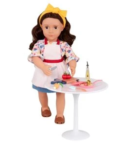 From food trucks to gourmet kitchens, Our Generation 18-inch doll Rayna has all the ingredients to create foodie adventures! Rayna has beautiful brown eyes that open and close, long, brushable brown hair that’s fun to style, and she’s posable! She can bend her arms and legs to cook up tasty meals! Use Rayna’s order pad to collect fun food orders and get cooking with the play food accessories. Chop up the onion and tomatoes on the cutting board and use the frying pan to create a delicious kebab (yum!). Don’t forget to keep Rayna’s outfit spotless with the super cute apron! She arrives wearing a colour-coordinated outfit that features a cute floral top, a bright yellow headband, and a blue pleated skirt. Follow Rayna’s adventures in her beautifully illustrated storybook, The Foodie Friends Project. The easy-to-read chapters are perfect for younger readers, and it makes for a great bedtime story too!