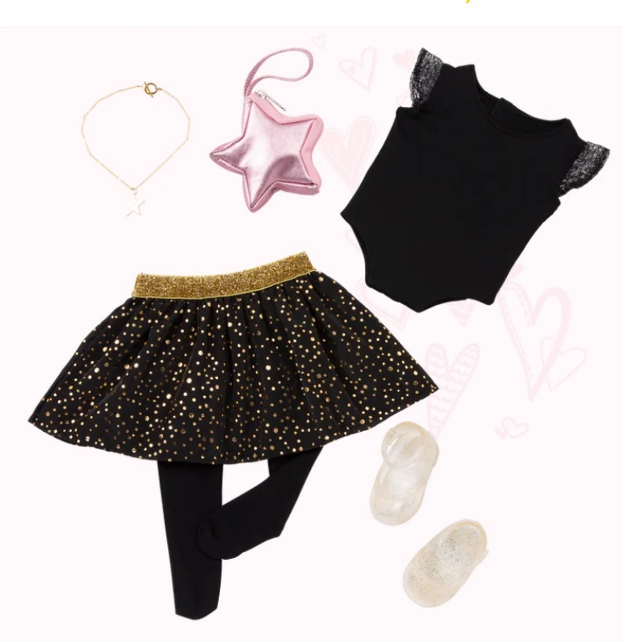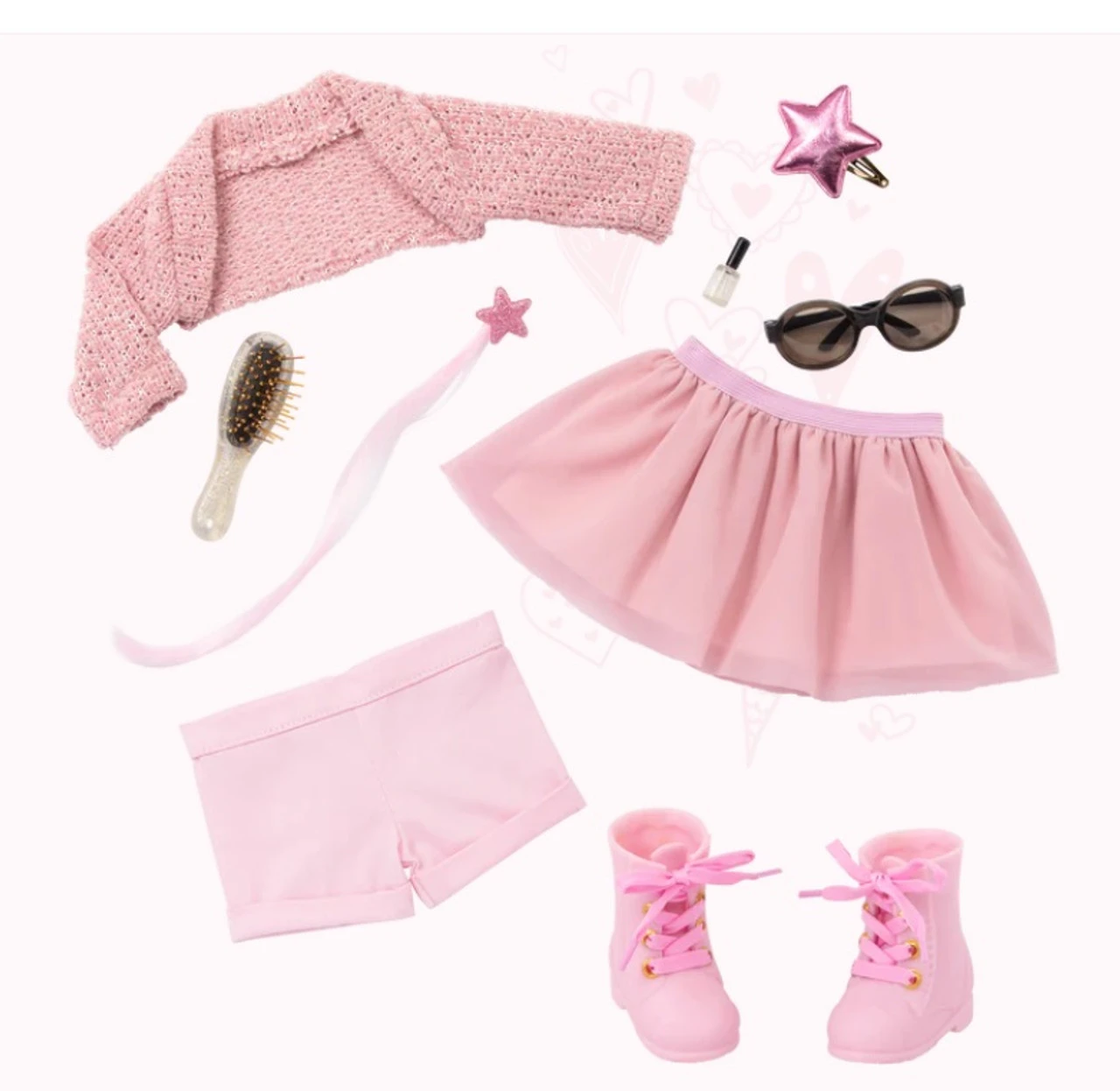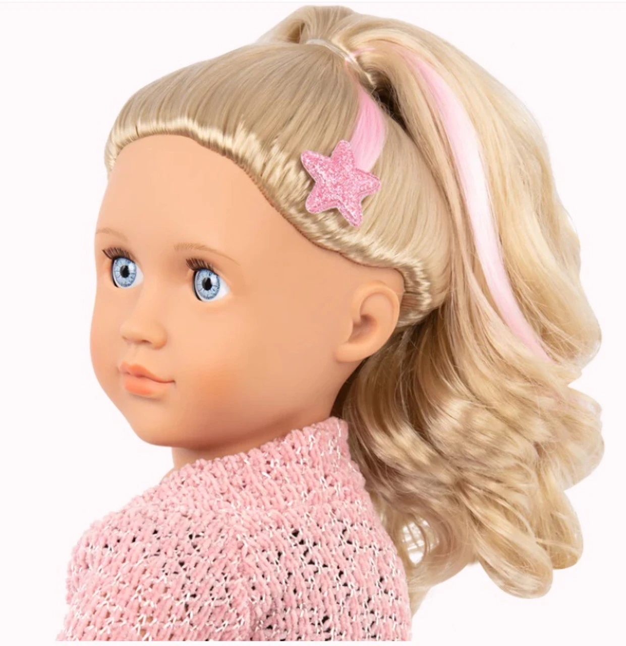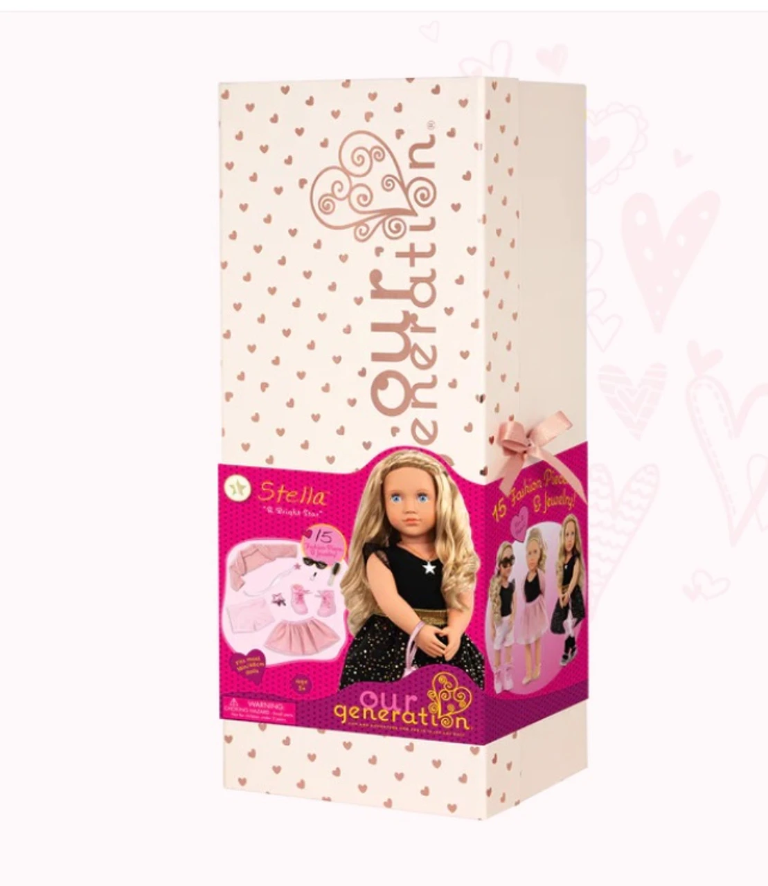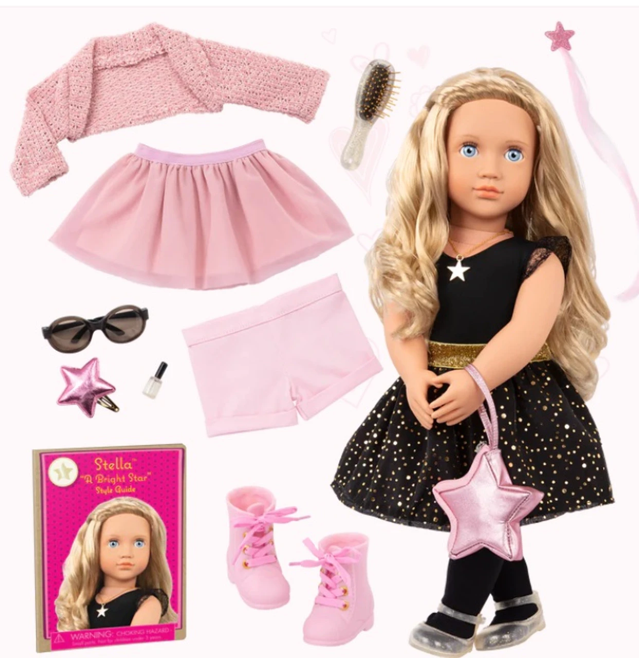 Star-themed fashion gift box set: create bright styles with Our Generation doll Stella, 3 changeable outfits, and jewellery accessories! 18-inch doll Stella: bright blue eyes that open and close with long, wavy, brushable blonde hair that’s fun to style! Easy to play: cuddly soft body; neck, arms, and legs rotate to easily change outfits. 3 changeable outfits: dress Stella in beautiful looks and accessorize with the sparkling jewelry pieces for extra star power! Styling booklet: follow the styling guide and make Stella shine in Casual, Party Passion, or Fun & Fancy themes! Includes: doll, leotard, 2 skirts, shorts, tights, star hair clip, shoes, boots, cardigan, star purse, sunglasses, pretend nail polish bottle, hairbrush, necklace, hair extension with glitter, and styling booklet. Mix & match: clothing and jewellery pieces feature easy-open closures to quickly put on and remove; compatible with most 18-inch dolls, outfits, and accessories.