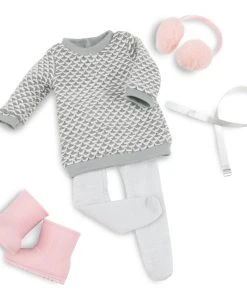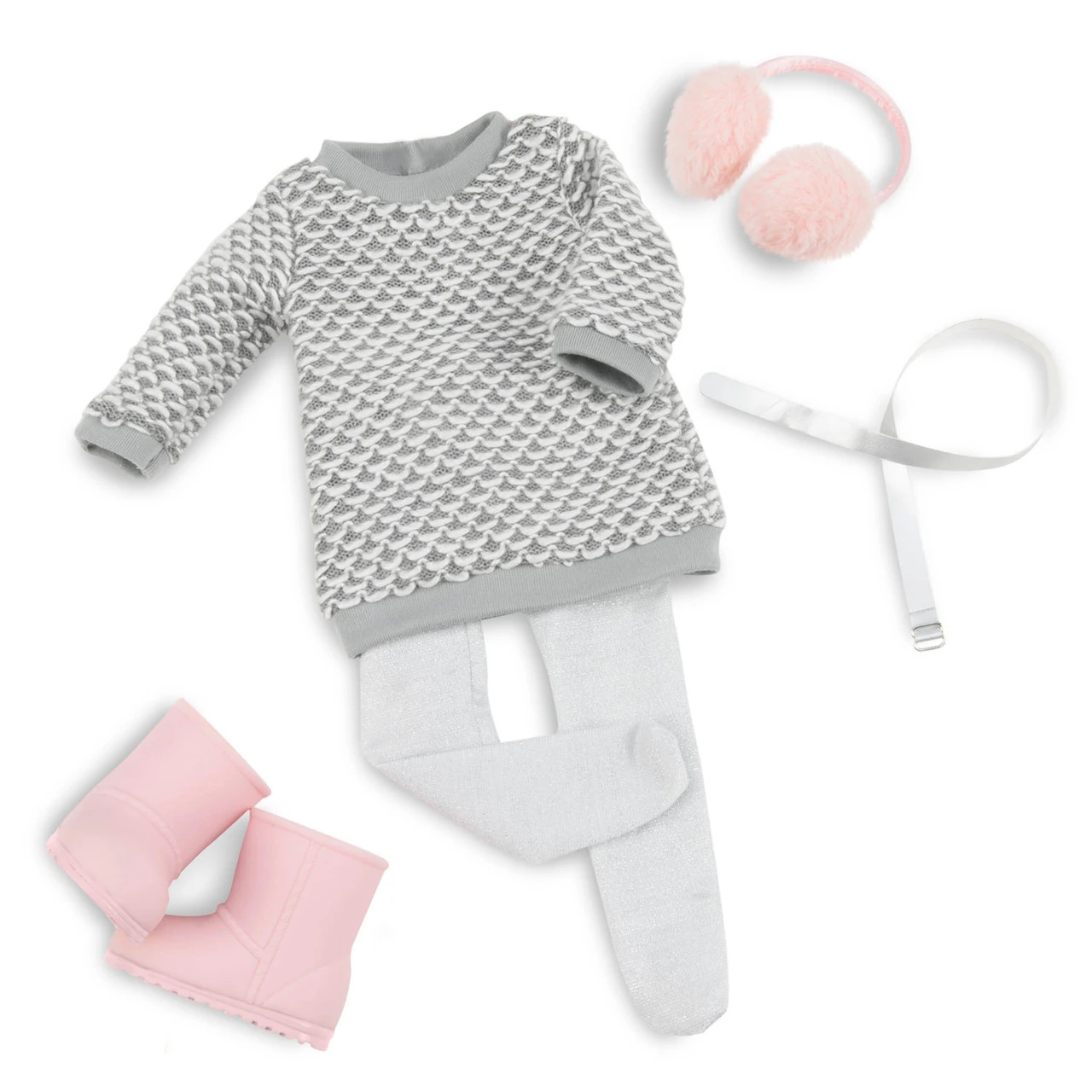 The knit grey and white jumper dress comes with a silver belt that is easy to mix and match with other clothing items, too! Wear the dress over the soft grey tights and pink winter boots for a coordinated look that’s icy cool. The matching fuzzy pink earmuffs will keep your doll’s ears warm without messing up her hairstyle (which is great news for kids who love to style their doll’s hair!) These delightful clothes for 18-inch dolls will make your dolls want to play in a winter wonderland all day!