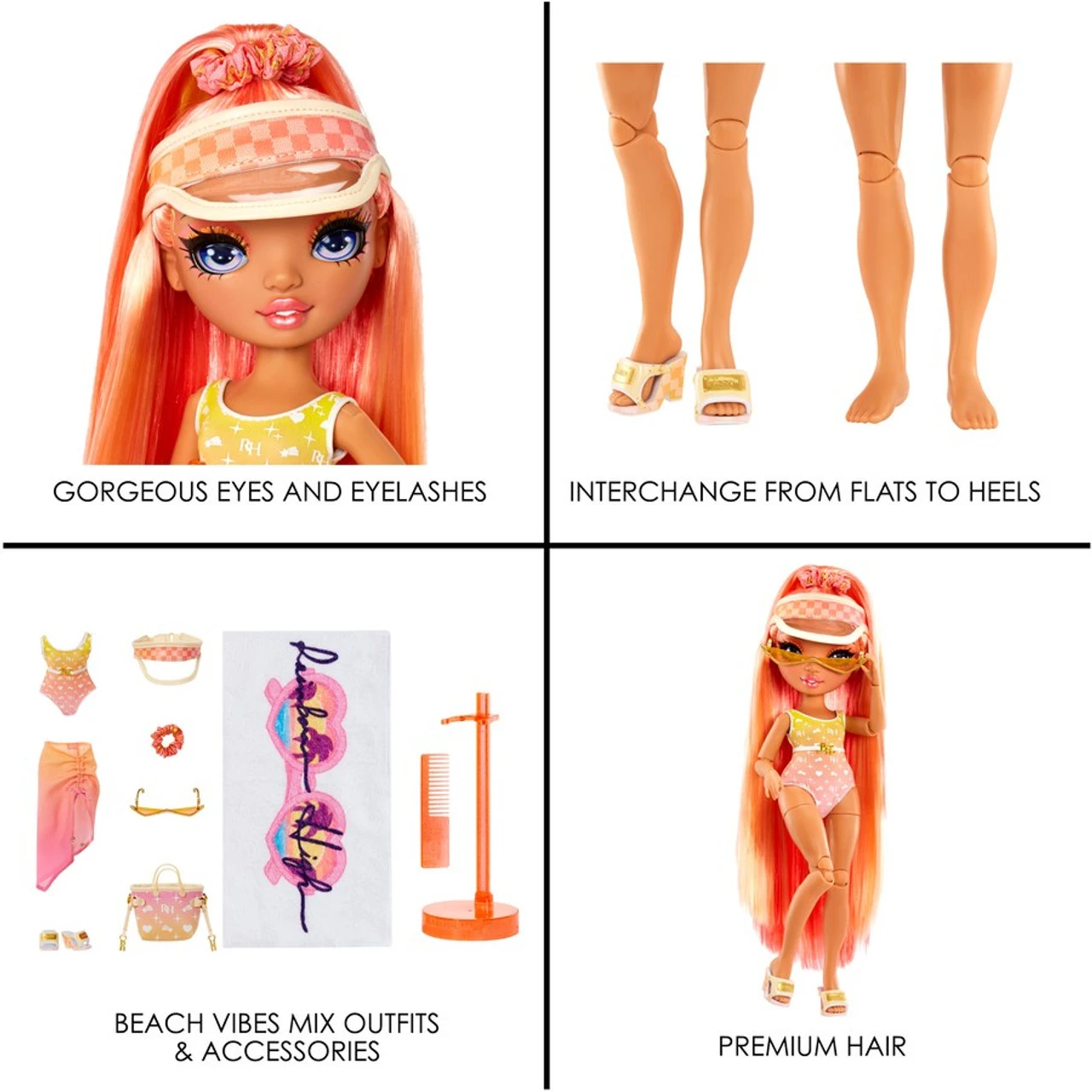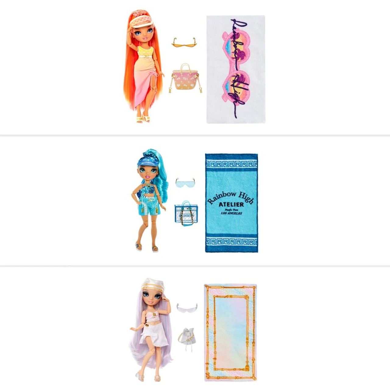 Rainbow High inspires creativity. Meet the students of Pacific Coast High, the most elite fine arts school on the west coast. Here the days are sunny and the classes are poolside. Each themed playset comes with complete doll outfit, signature must-have poolside accessories, and a bonus feature, interchangeable legs.