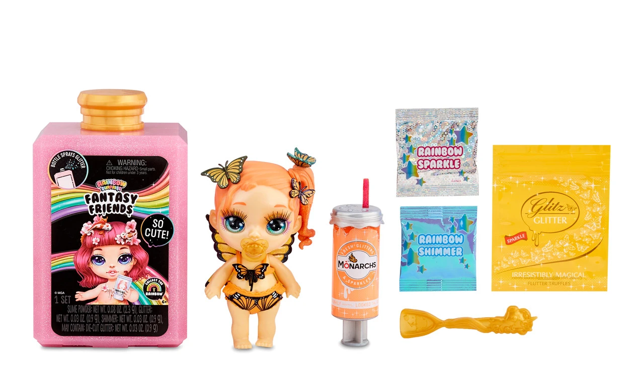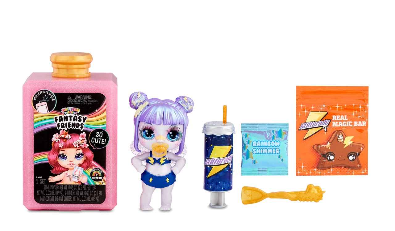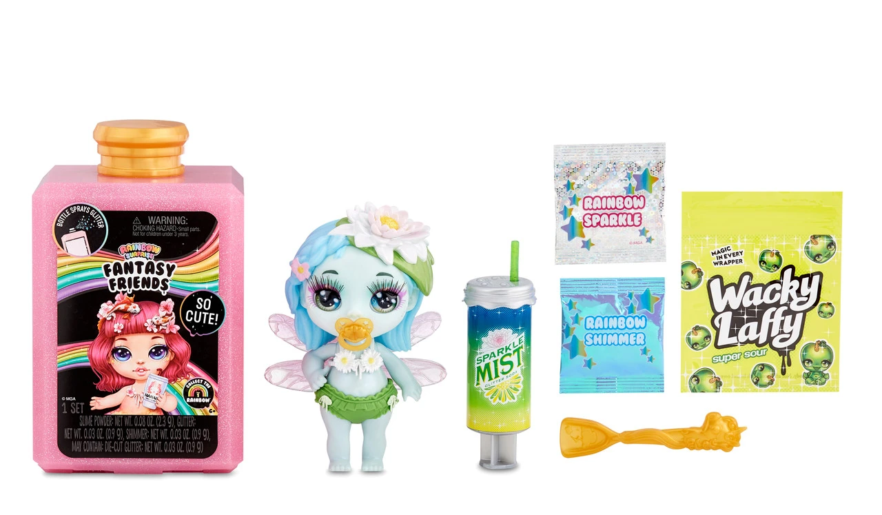 • Rainbow Surprise Fantasy Friends are the adorable, mini dolls that spit slime and toot glitter!