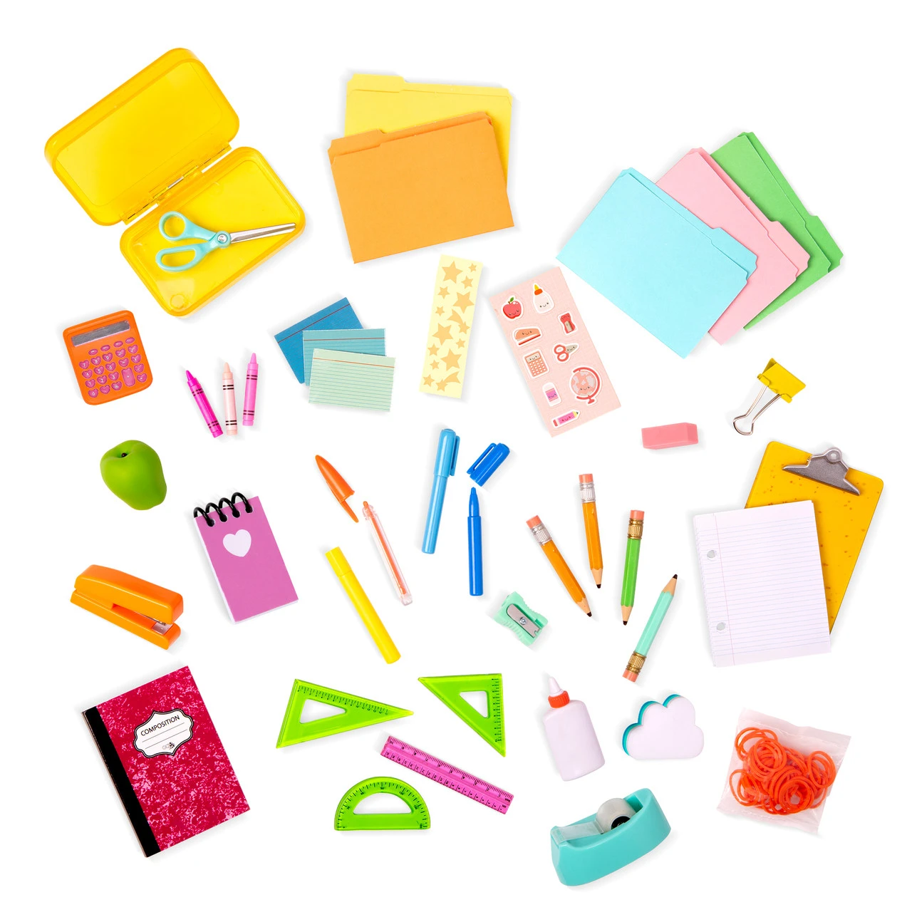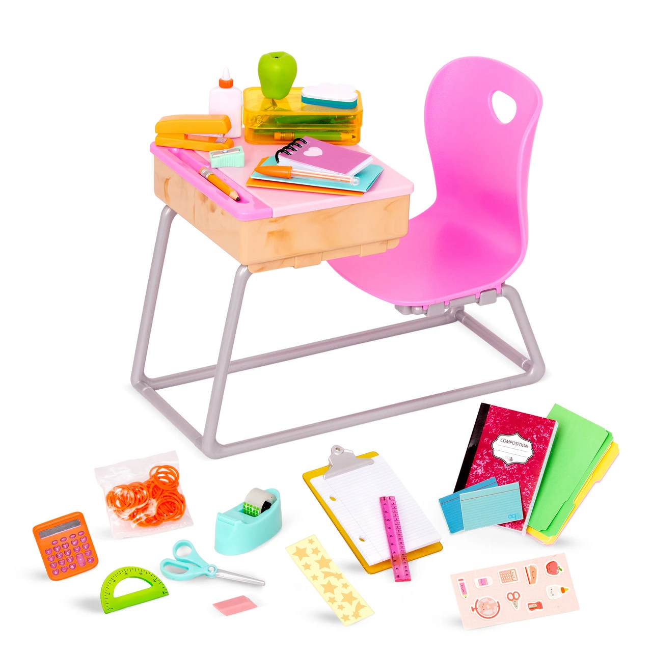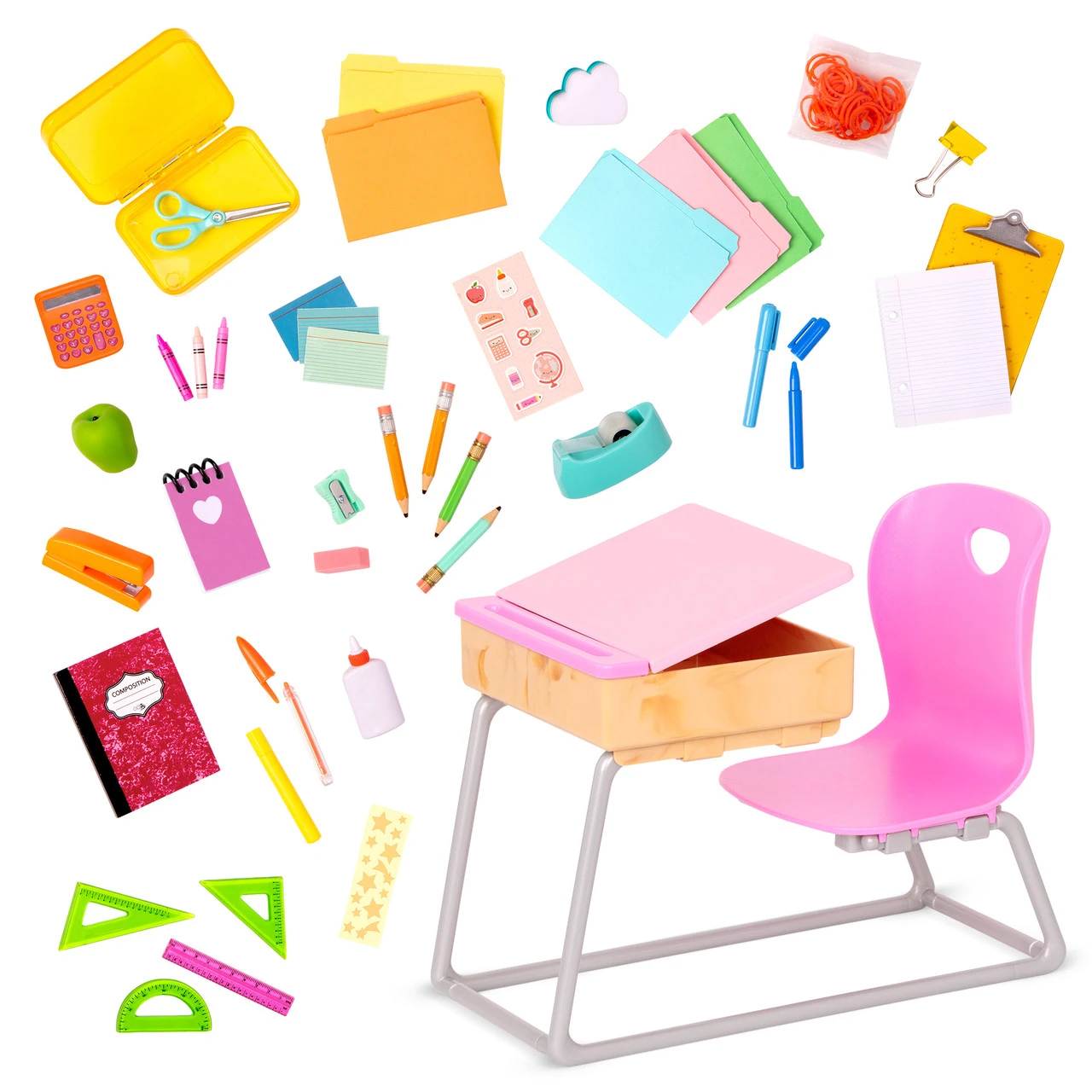 1 student desk, 1 apple, 4 pencils, 1 sharpener, 1 protractor, 1 isosceles triangle ruler, 1 rectangular triangle ruler, 2 markers with 2 lids, 22.86 x 29.54 x 30.48 cm